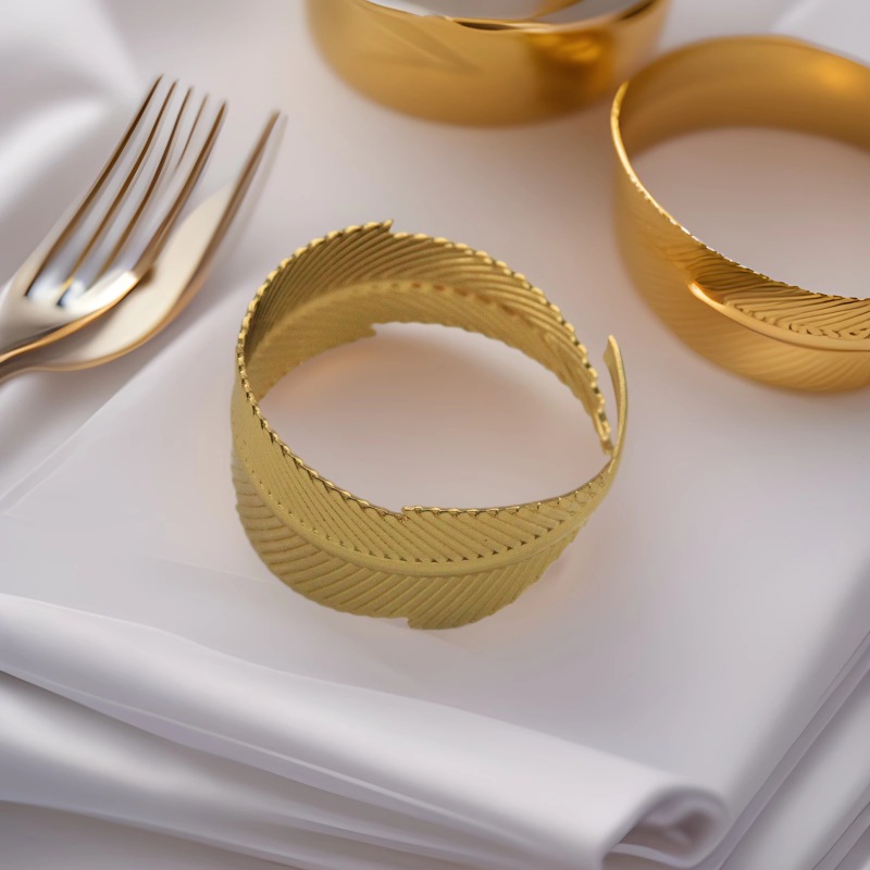 金色の金属製の大きな葉っぱ型の新しいナプキンリング、洋食レストラン、ホテル、メーカー卸売、テーブル、ホテル用品