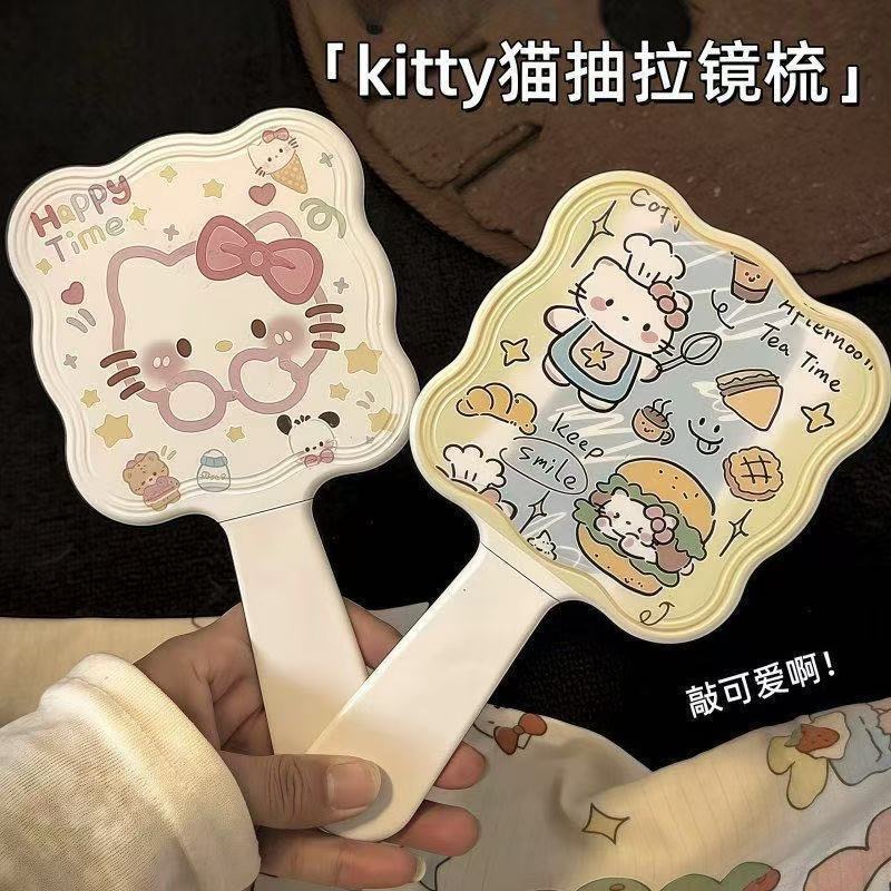 ins可爱卡通KT猫手持化妆镜子带梳子高颜值手柄镜高清便携随身镜