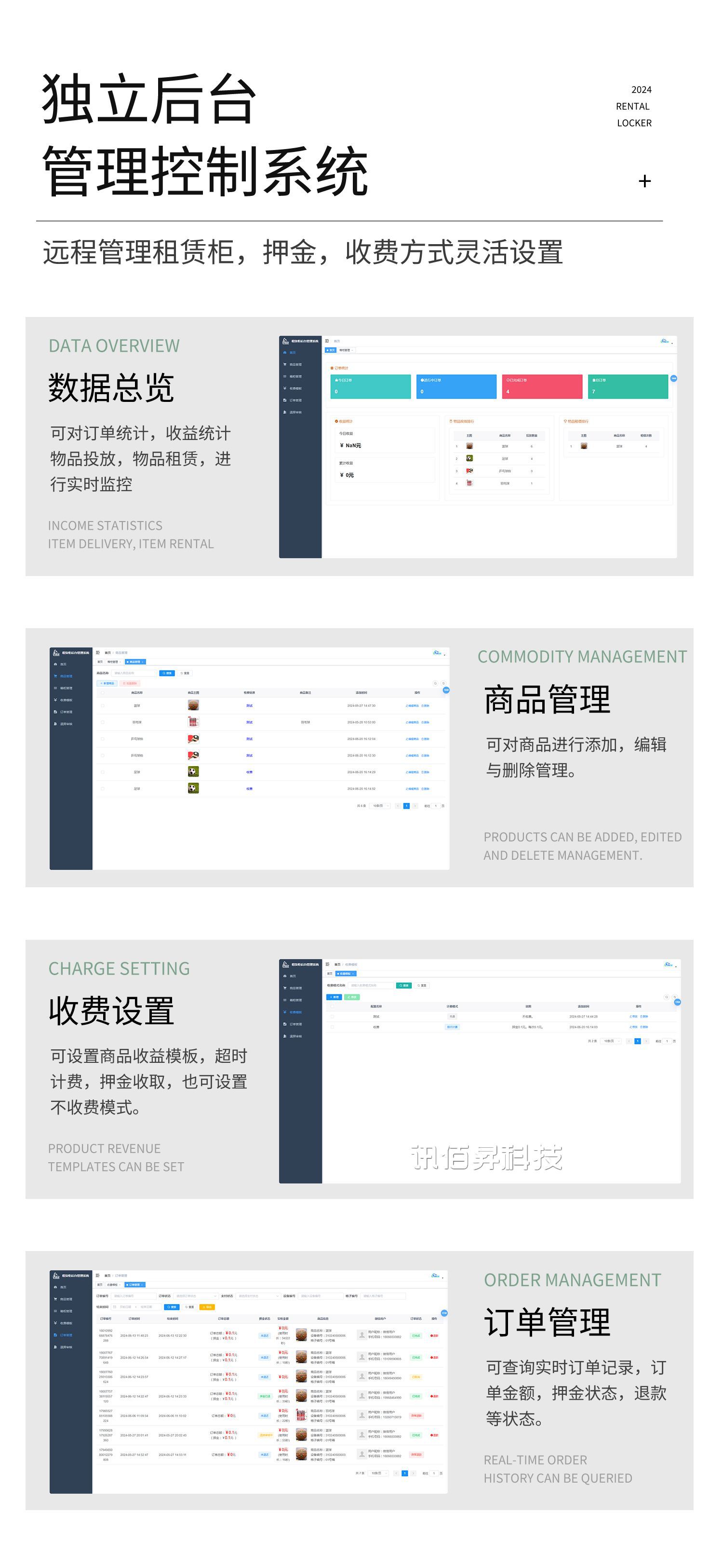 智能租赁柜先进的技术实现租赁流程的自动化管理和智能化操作,可以实现人脸识别、刷卡与扫码、自助租赁与归还、实时监控与管理、客户可以根据放入的物品设置收费标准及押金模式,管理员通过电脑或手机APP远程监控设备状态、管理库存、分析使用数据,实现精细化管理。