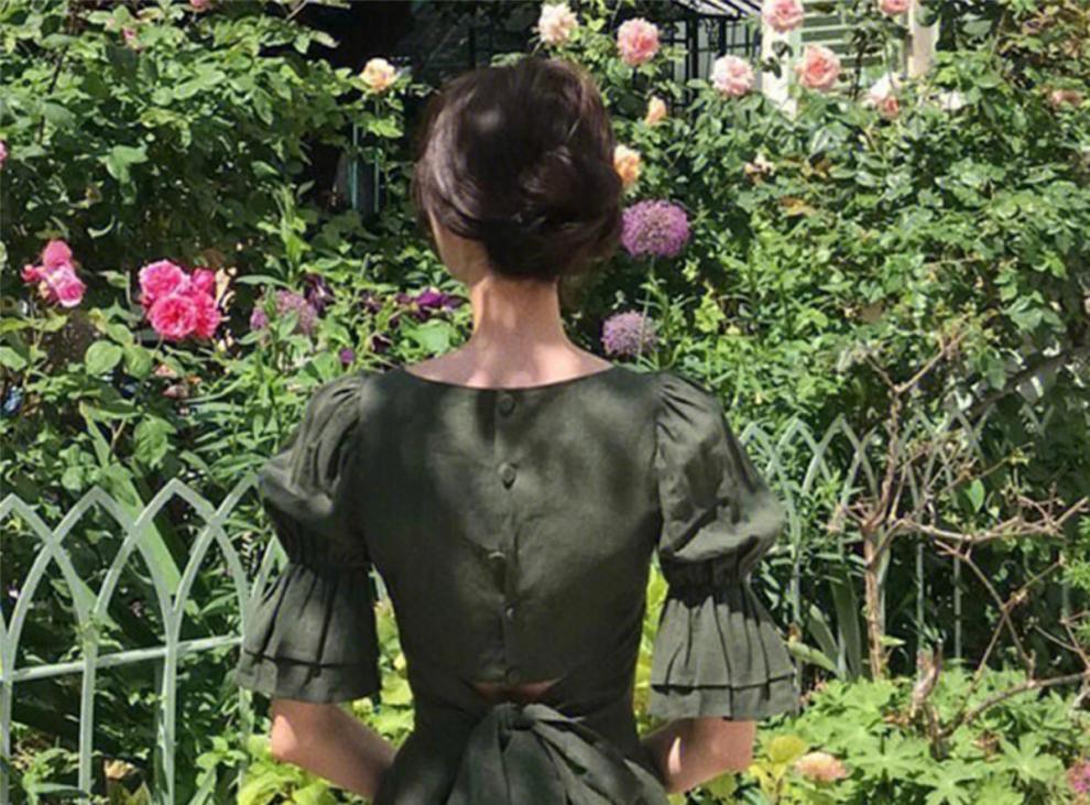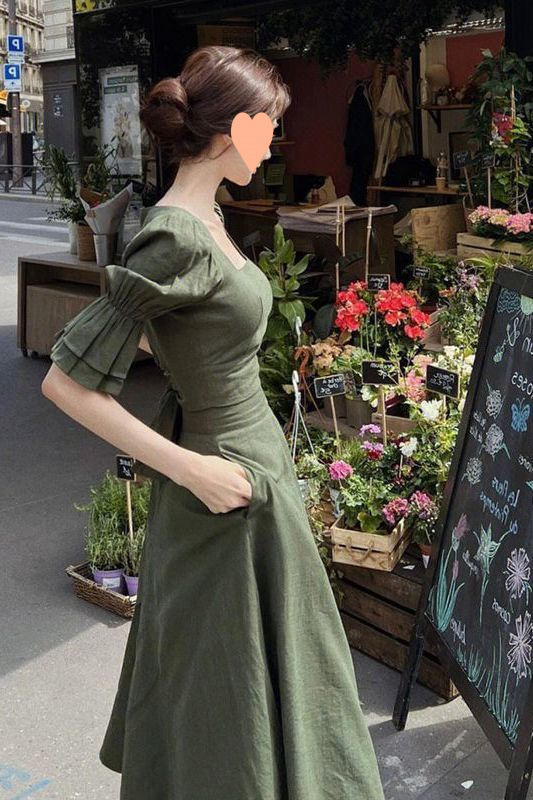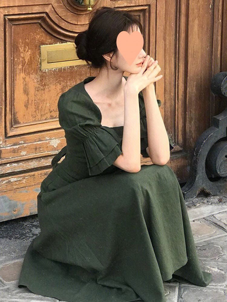 フレンチレトロヘボンスタイルのハイエンドスクエアネックパフスリーブドレス女性の夏の新しいドレープウエストロングスカート