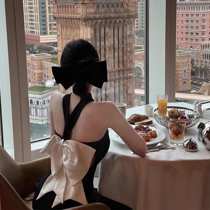 気質ワンラインネック甘辛スタイルスカート2025秋新作リボンバックレスブラックホルターネックチューブトップドレス