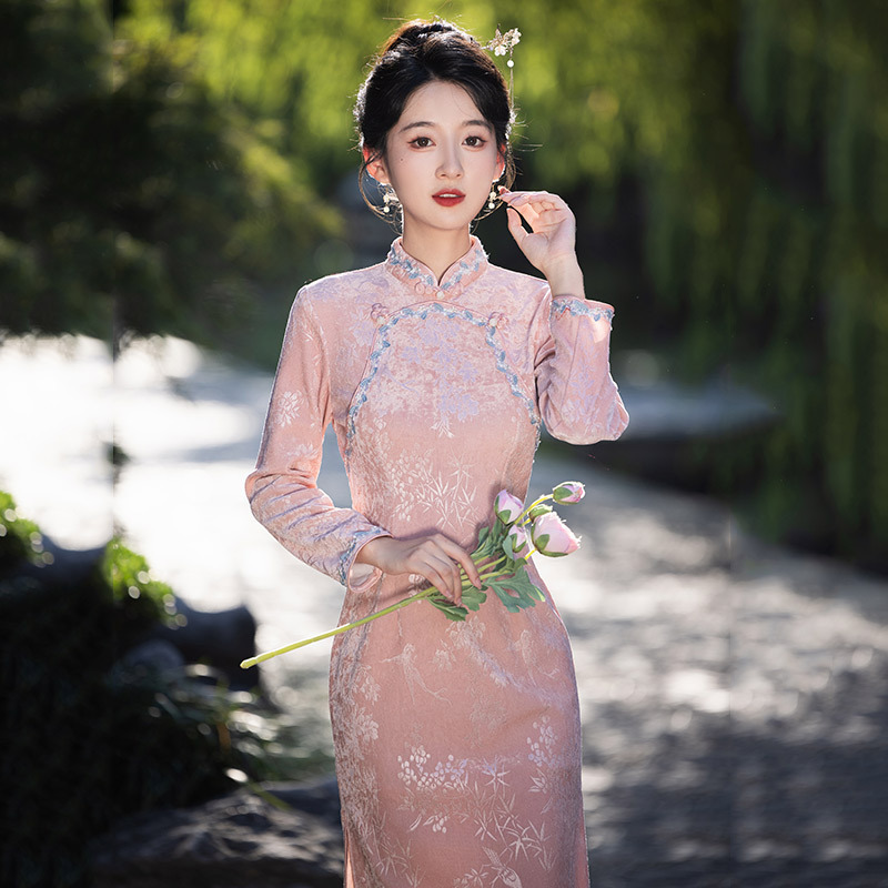 ピンク色の中国風新中式ロング丈秋用長袖旗袍改良版、若い女性向け、高級感のあるレトロなシルエット、秋冬用