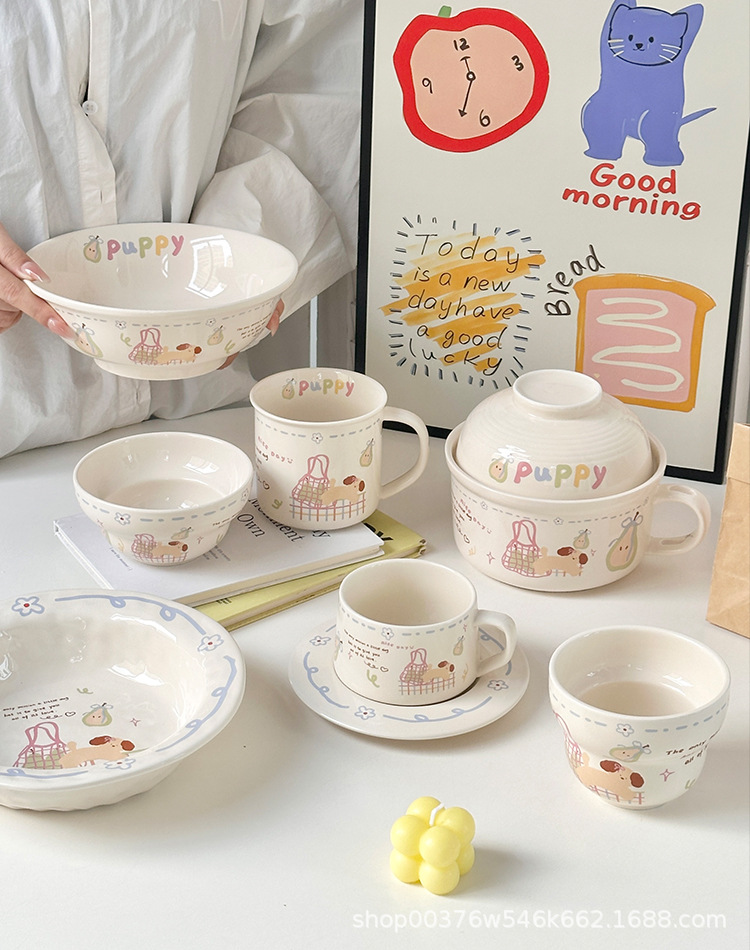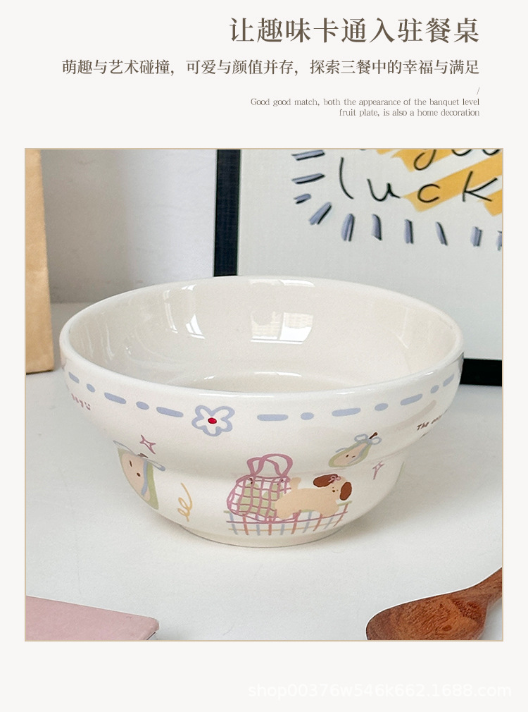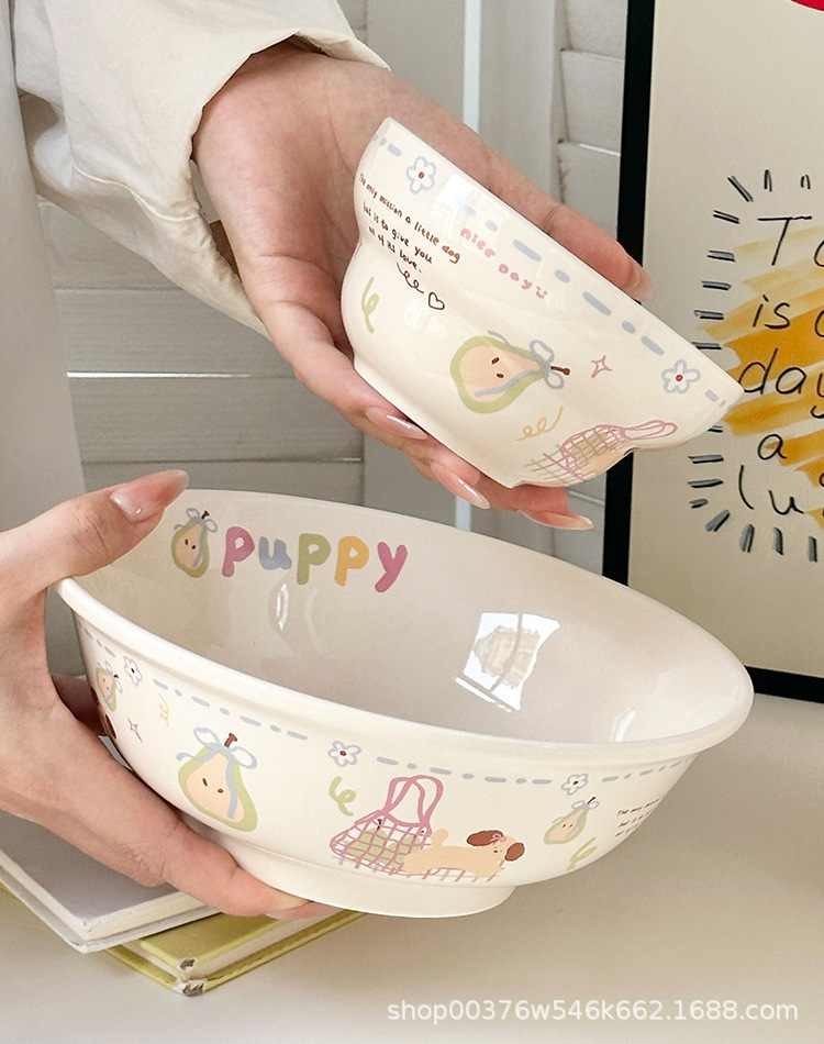 創意的な手はかわいい犬の深皿を握って、家庭用陶磁器のスープの皿のパスタのサラダの皿の軽食の皿の料理の皿の朝食の皿