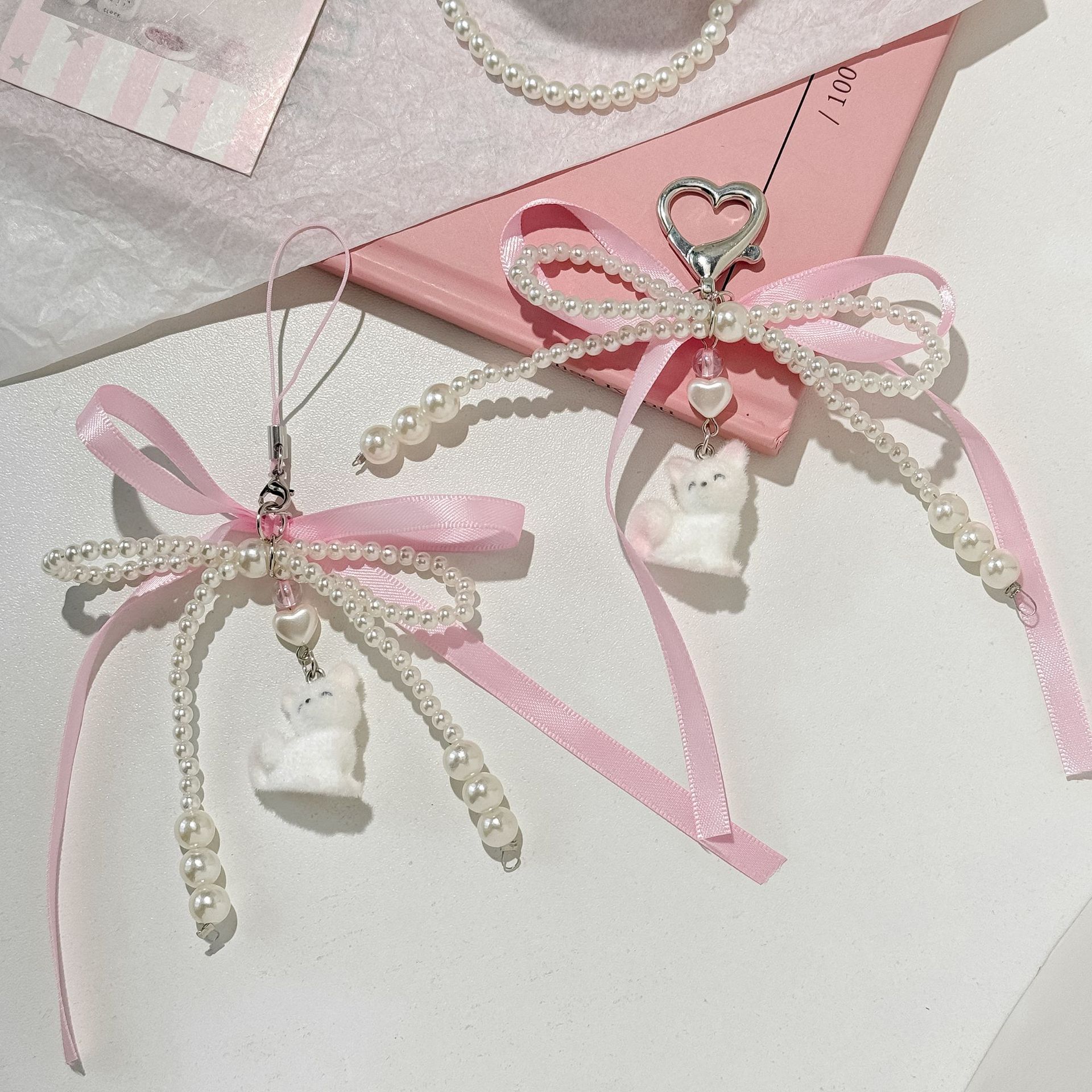 日本と韓国のかわいい植毛子猫バッグペンダント甘いパールリボンキーホルダージュエリーペンダント携帯電話チェーン