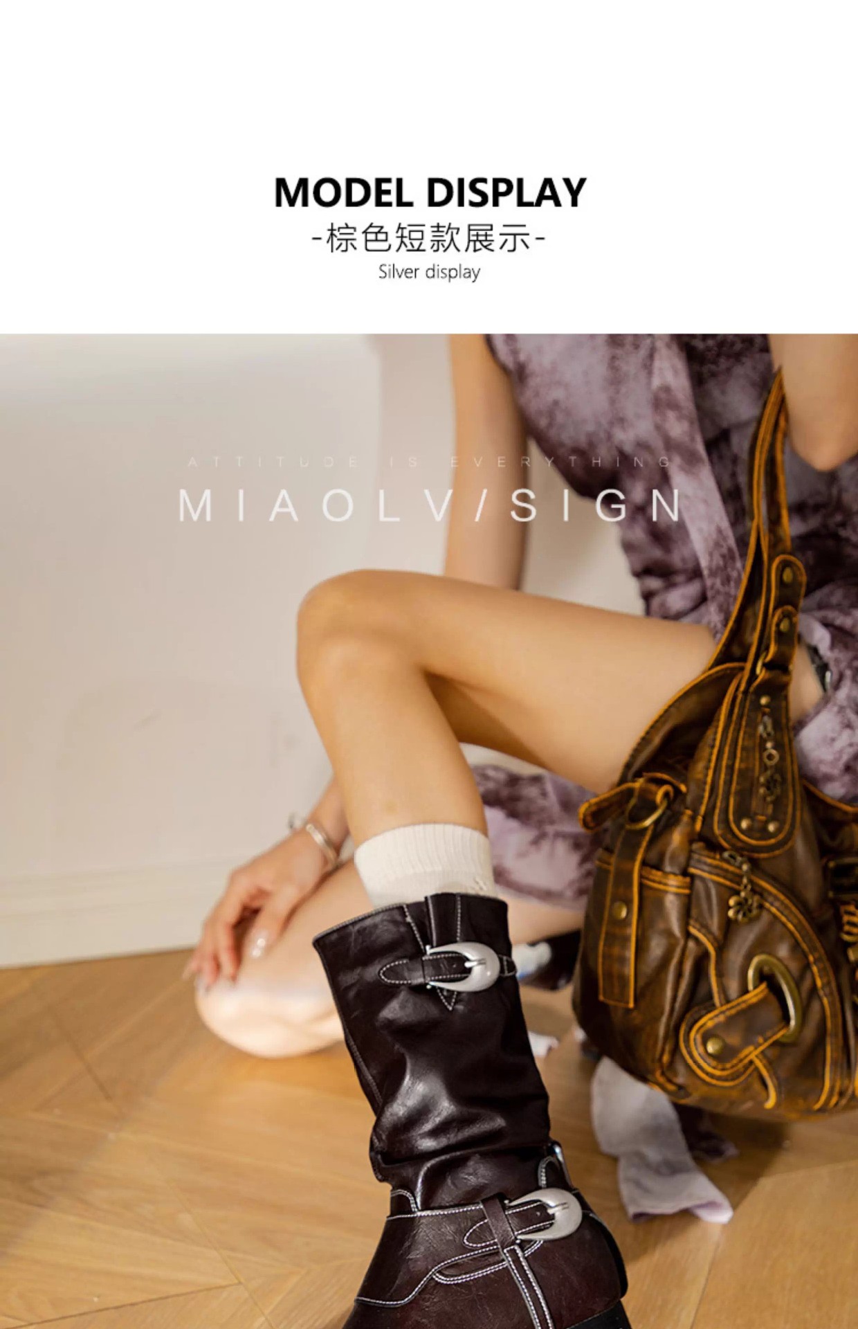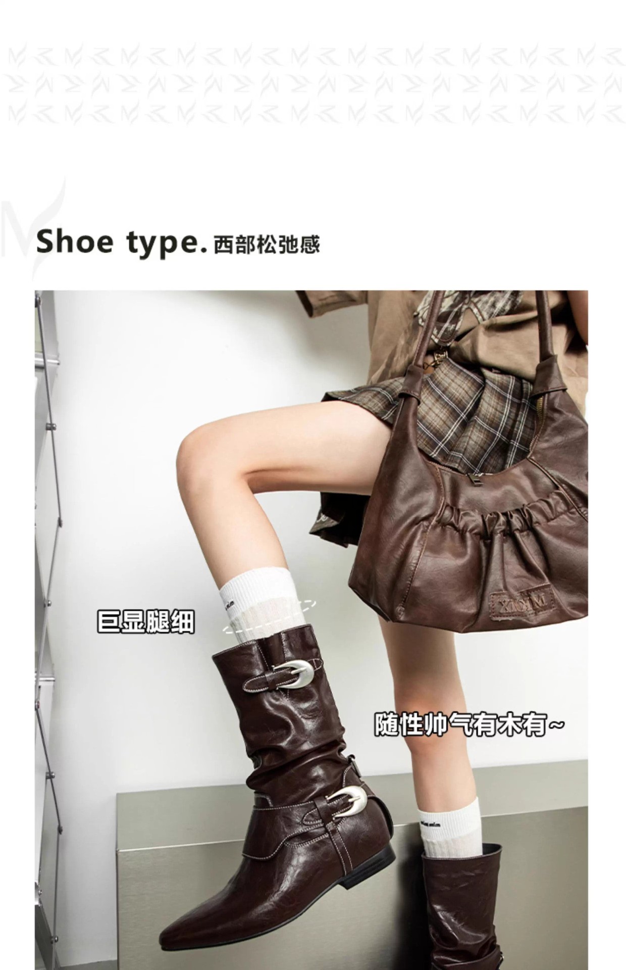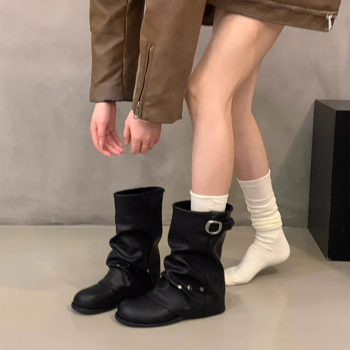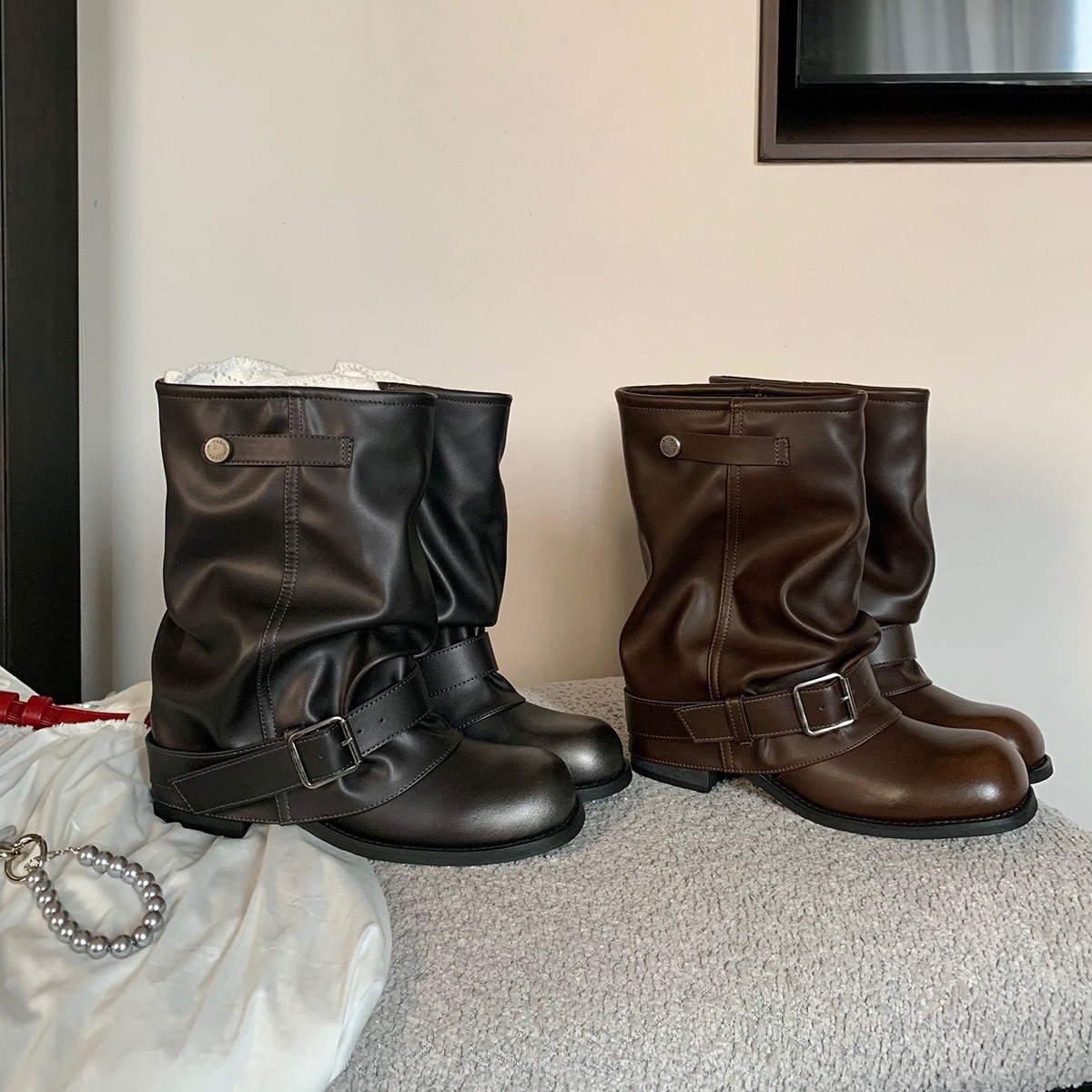 Mooreyu原创牛皮西部短靴女堆堆靴粗跟设计褶皱尖头骑士靴裤管靴