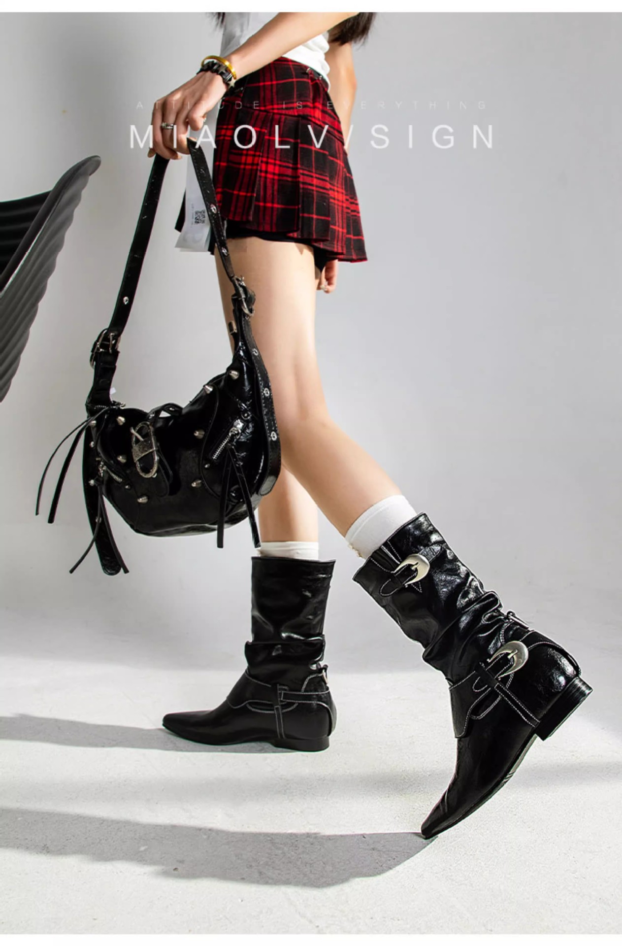2025秋冬新款辣妹黑色舒适铆钉尖头靴子女朋克风炸街高筒时装靴女