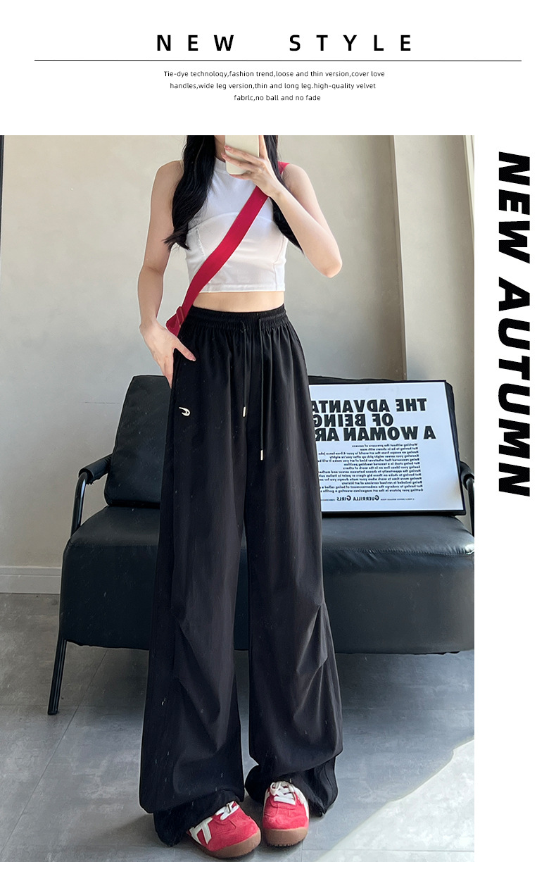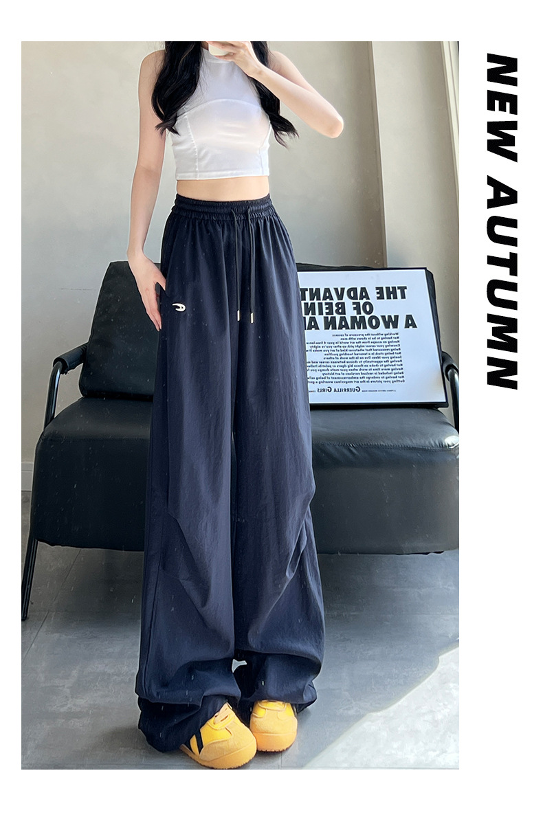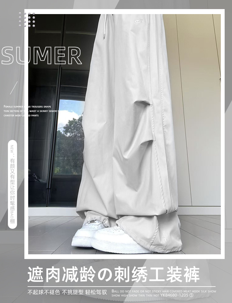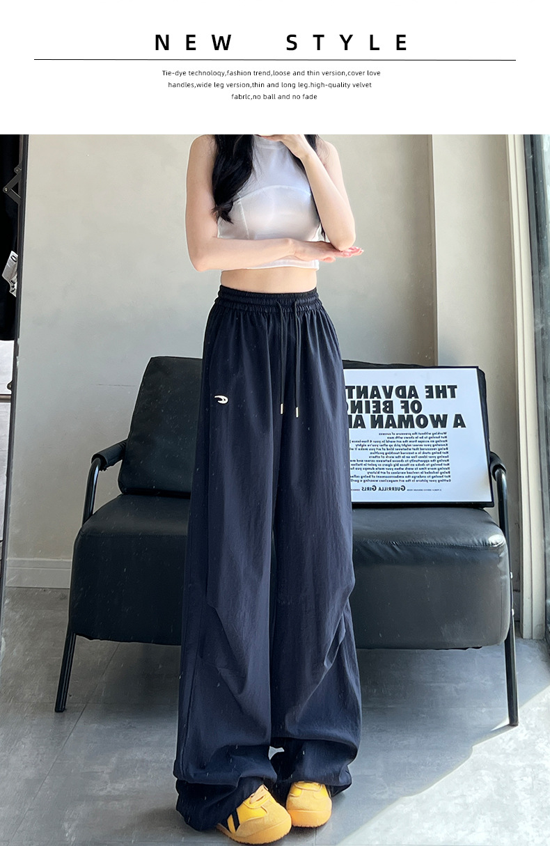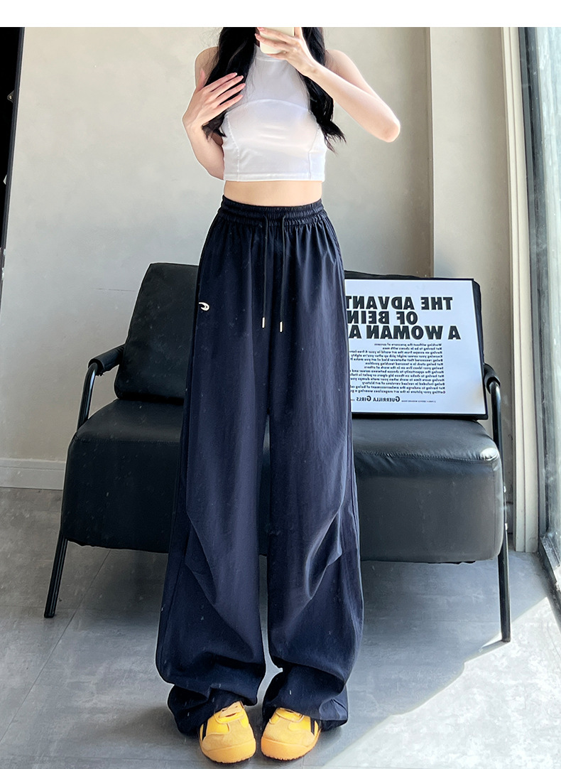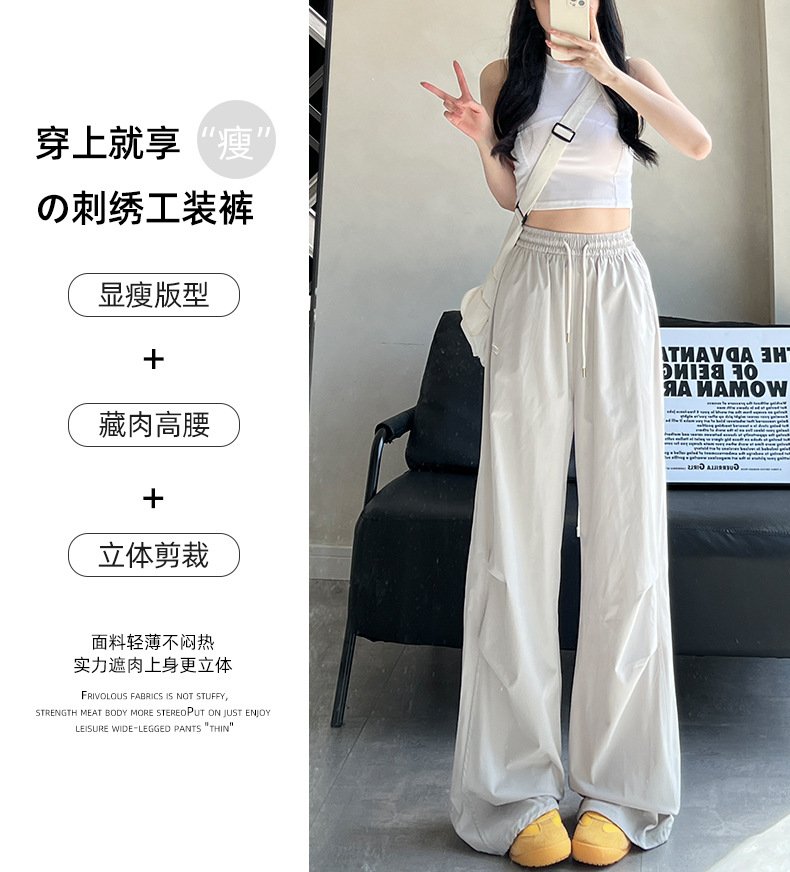 夏用の女性用グレー刺繍スウェットパンツ、薄手、ハイウエスト、スリム、ゆったり、ドレープ、速乾性アイスシルクオーバーオールパンツ