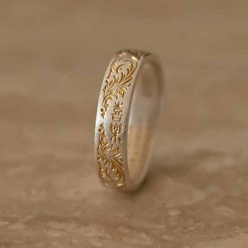 純銀足銀999唐草紋描金中実開口指環内壁心経復古中国風