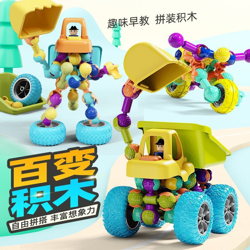 大颗粒拼装工程车积木智力开发拼插动手收纳桶男女孩儿童玩具