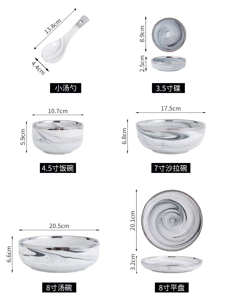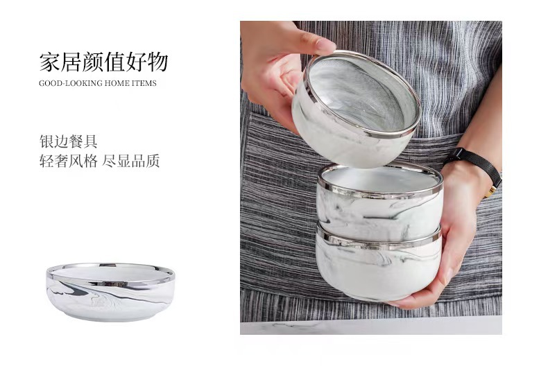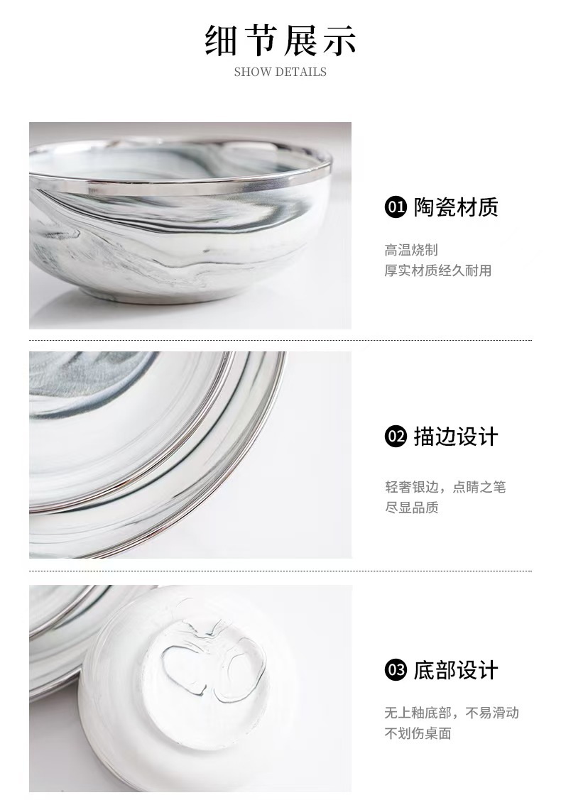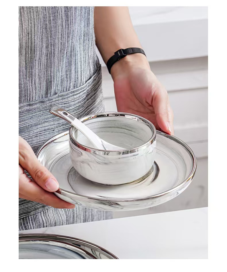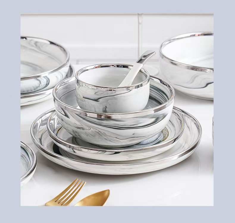 釉下色シルバーエッジ大理石食器セット家庭用高級食器ボウルとプレートクロスボーダーボウルと箸の組み合わせ卸売