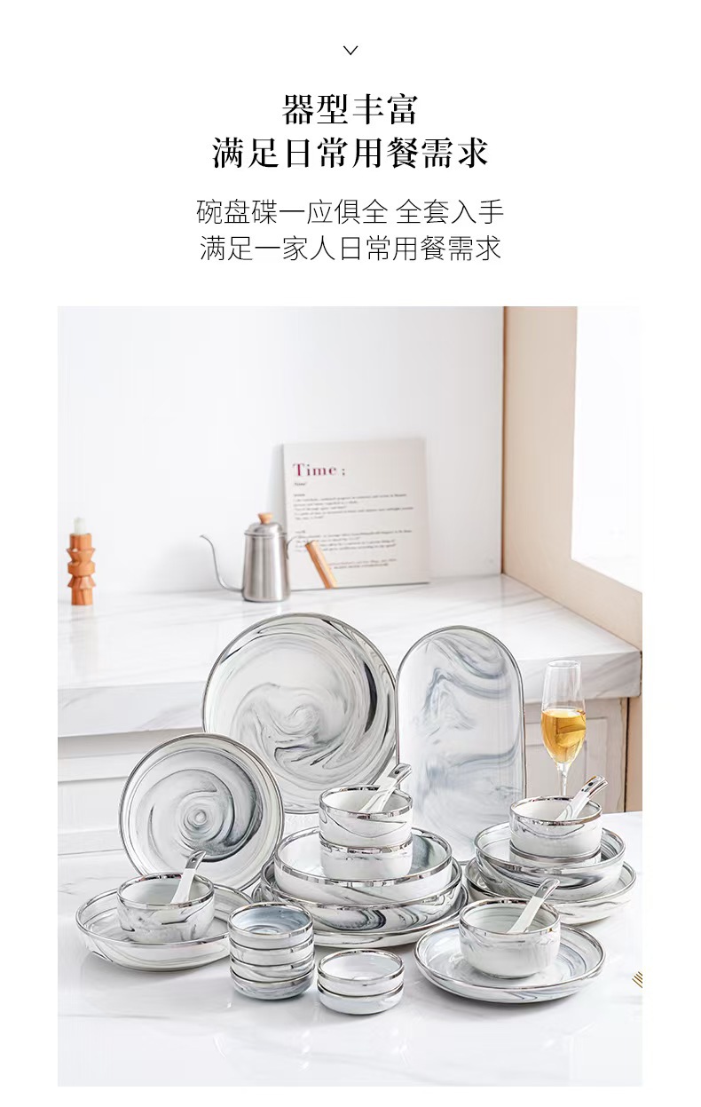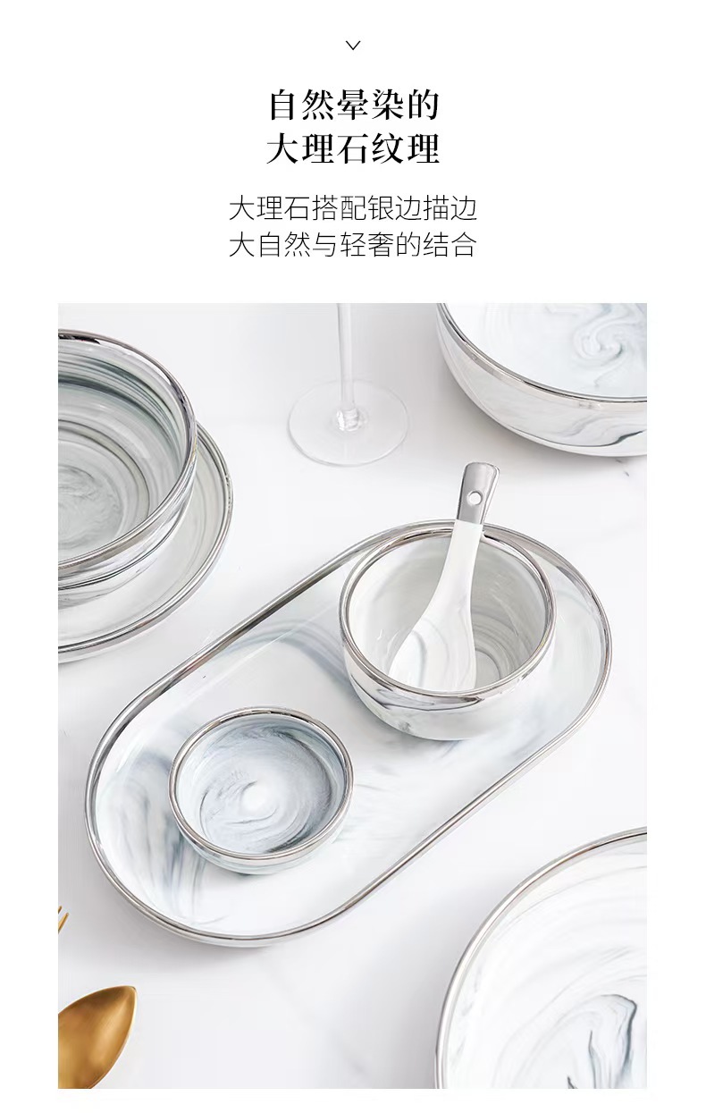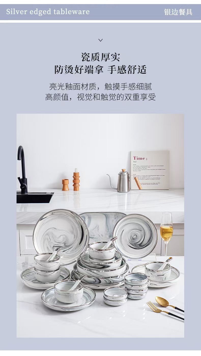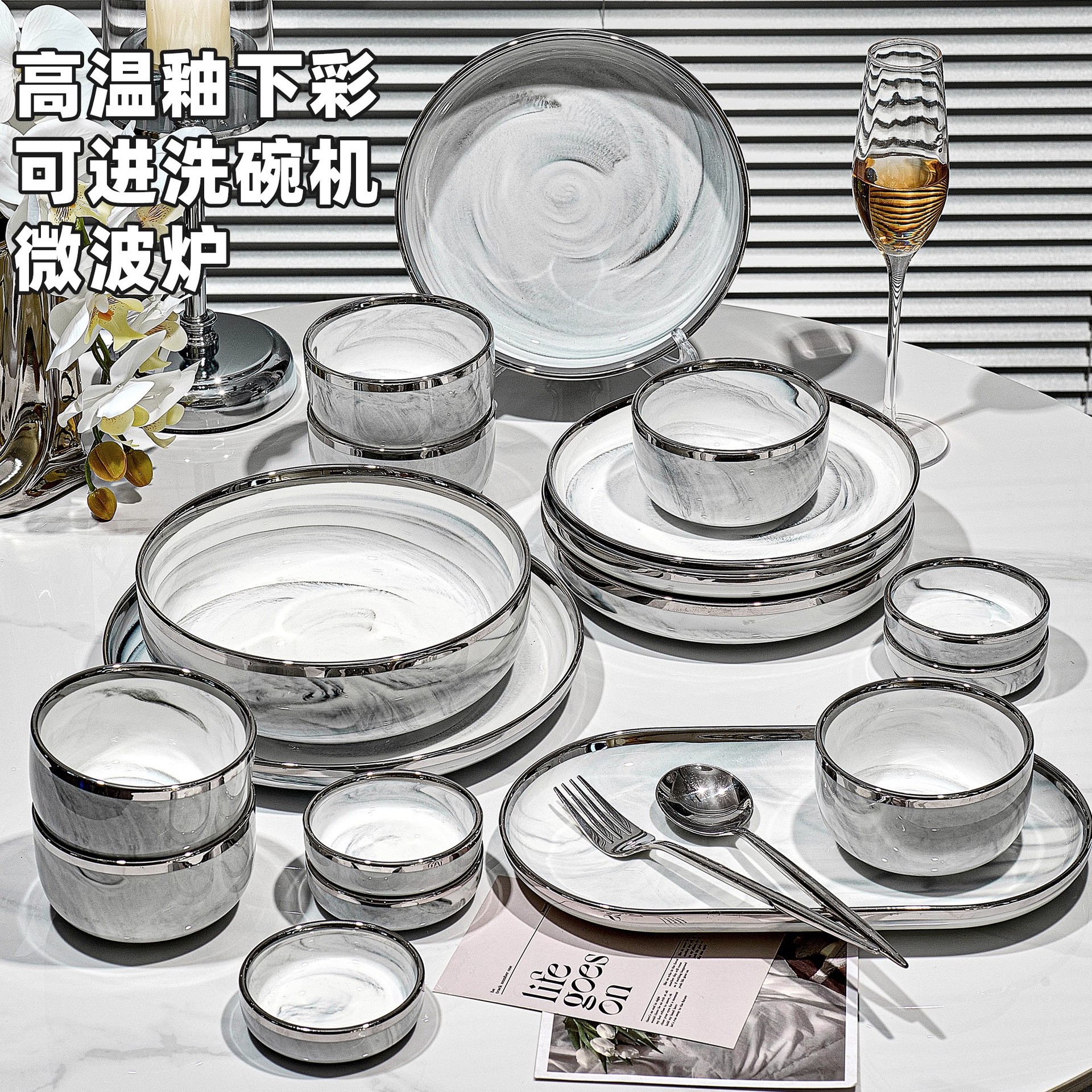 家庭用2024新型食器皿セット大理石銀辺軽贅沢食器皿セット