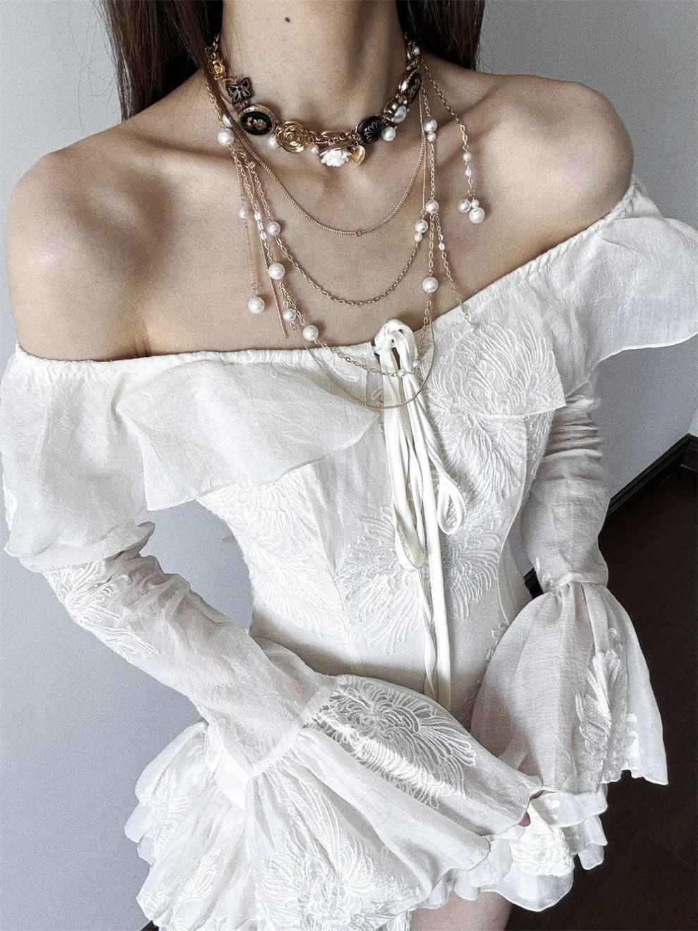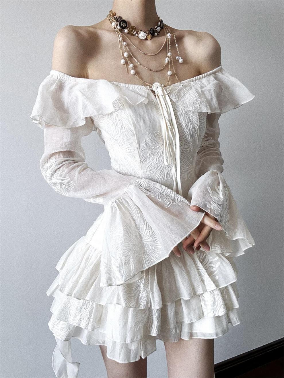 フレンチフリルヘビーデザインワンショルダー長袖ドレス春の新作ウエストリボンケーキスカート女性用