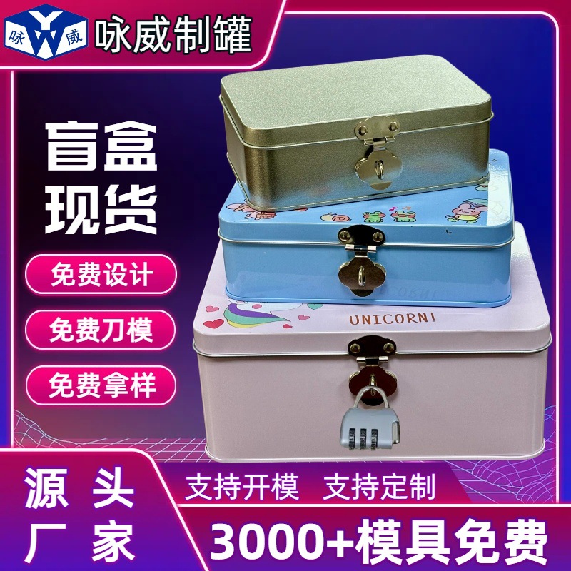 现货供应私域引流马口铁盒存钱罐储物钥匙锁密码锁金属铁盒盲盒