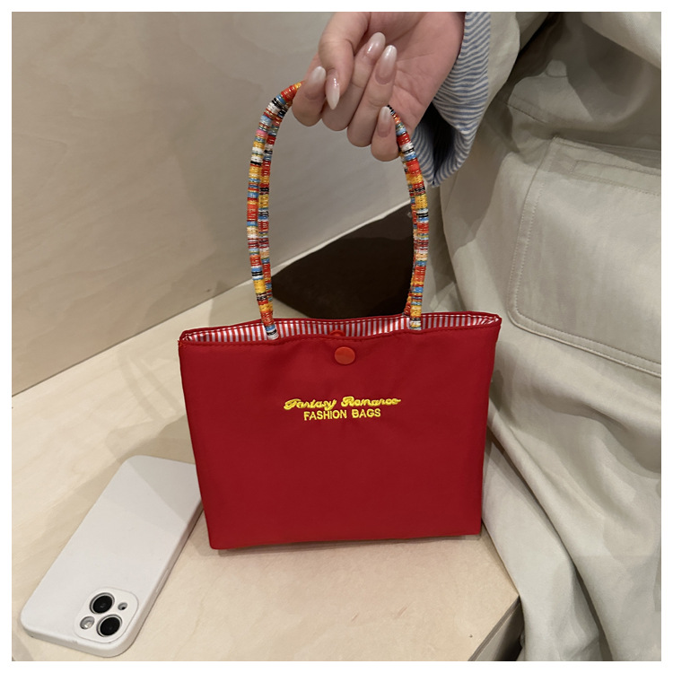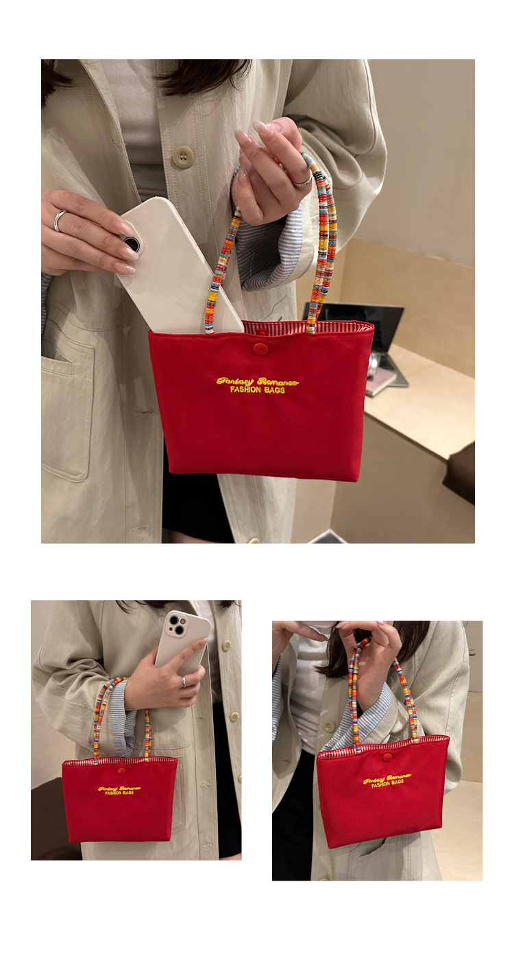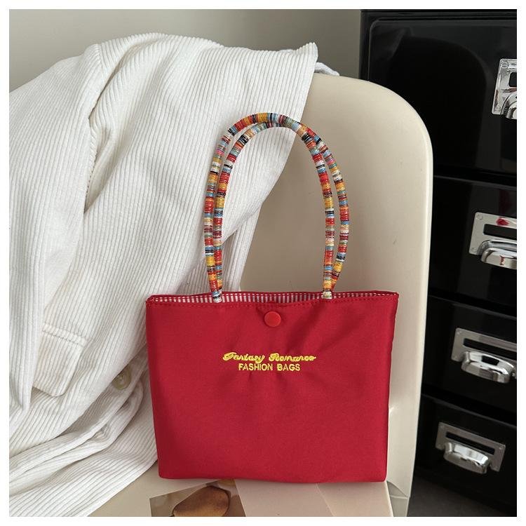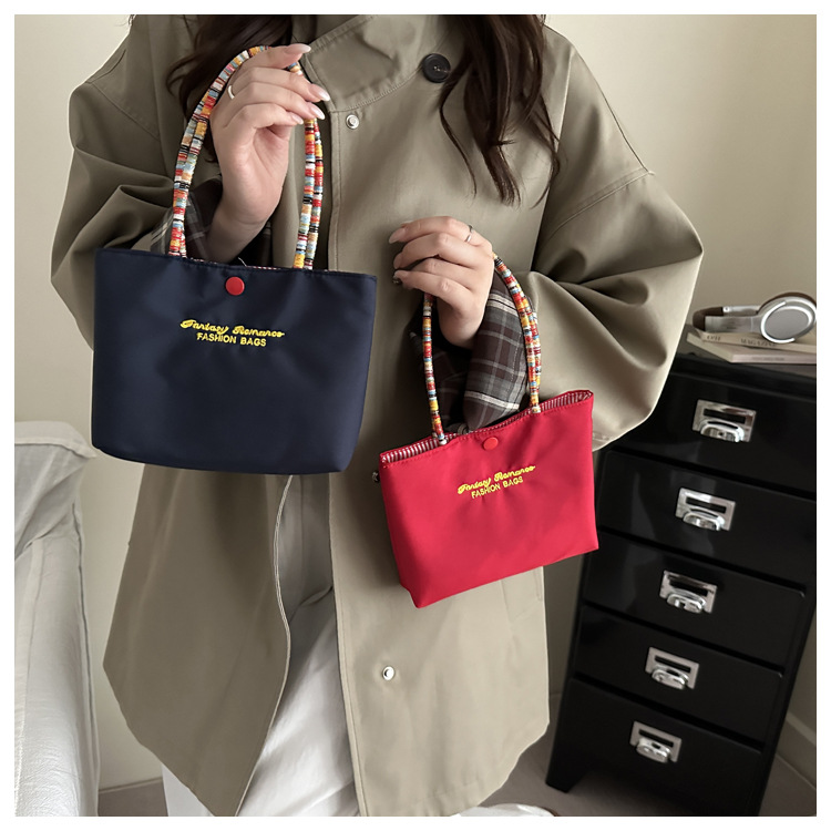 韩系复古刺绣字母手提包2025新款便携彩绳撞色帆布包潮个性手挽包