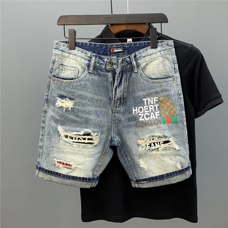夏の新作メンズリップドデニムショートパンツ、トレンディなブランドパッチプリントミッドパンツ、トレンディで多用途な乞食パンツ