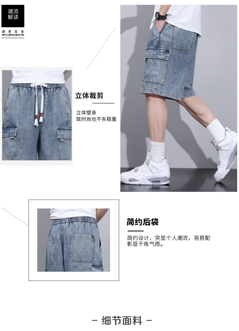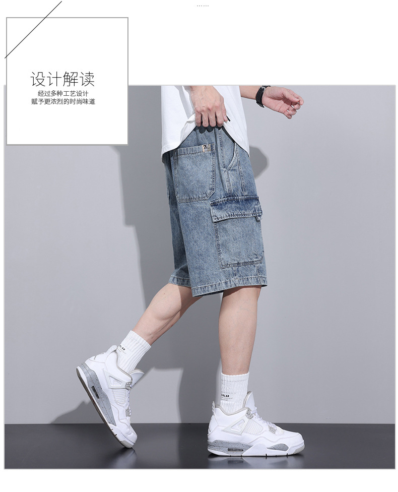 リップドパッチデニムショートパンツメンズトレンディブランド2024夏薄手トレンドスプライシングワークウェアマルチポケットミッドパンツ