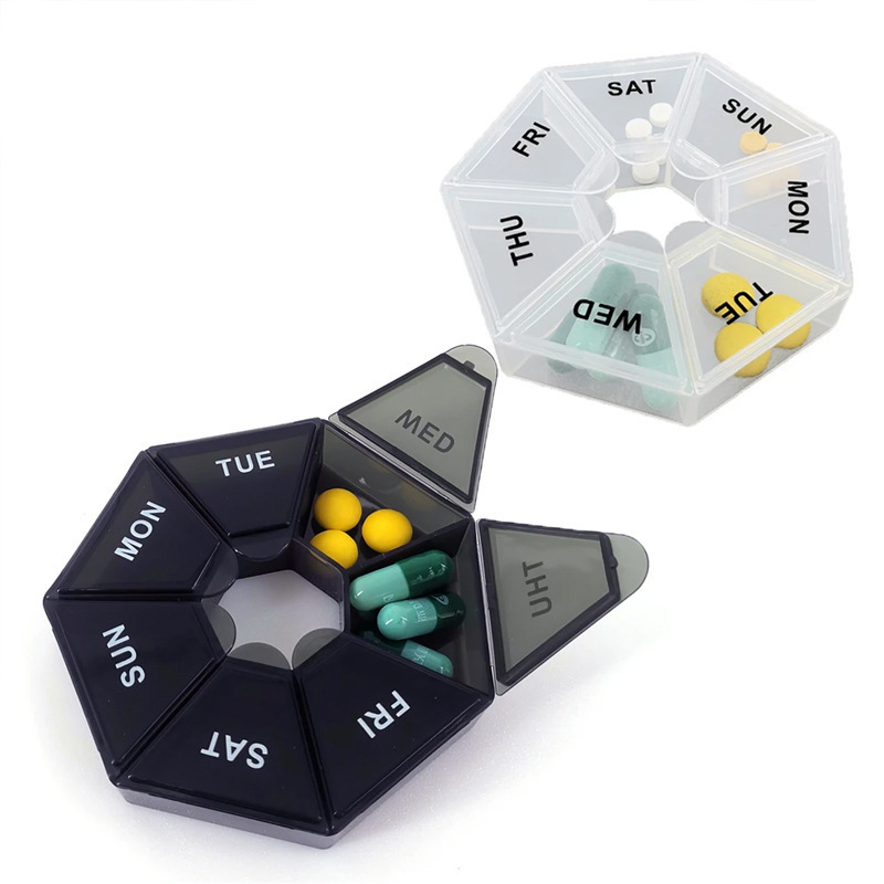 在庫あり 1 週間ピルボックス 7 コンパートメントラウンドピル収納ボックスポータブル小型ピルボックス 7 角ピルボックス