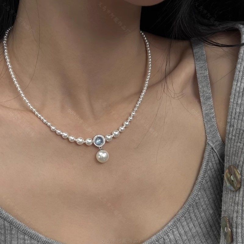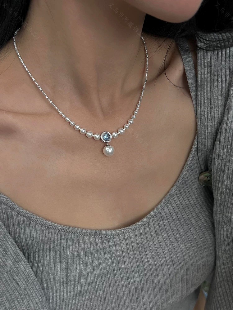 「鲛人語」海藍宝白水晶淡水真珠ネックレス2024気質高級感精致鎖骨鎖女