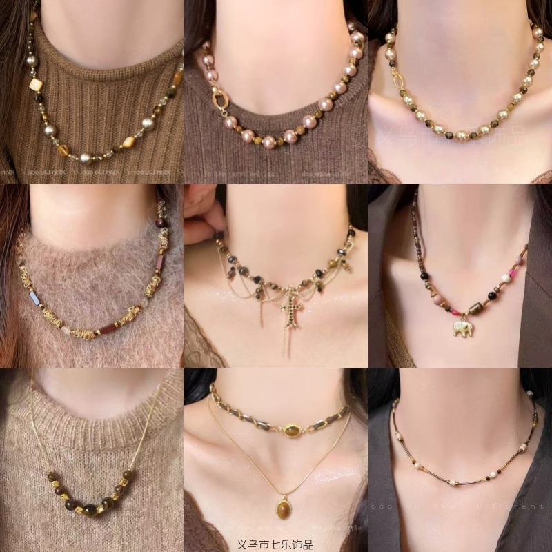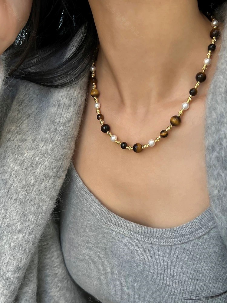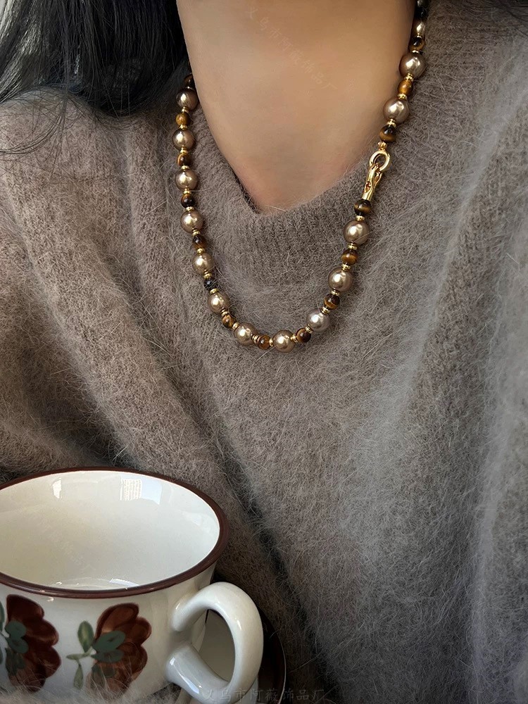 美拉德虎眼石串珠项链女秋冬锁骨链轻奢小众毛衣链复古锁骨链饰品