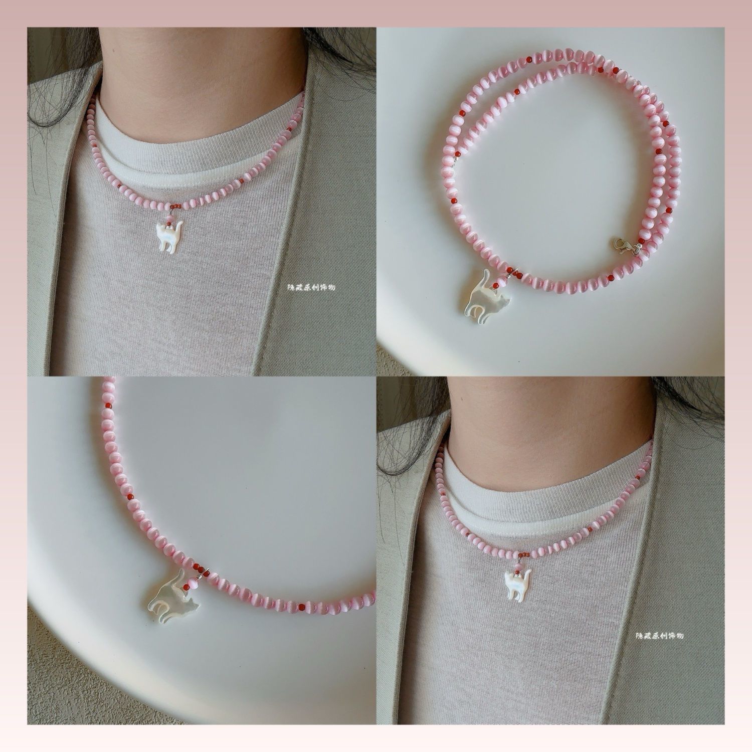 【少女的猫】原创粉猫眼石夏日简约白蝶贝猫咪串珠项链女小众甜美
