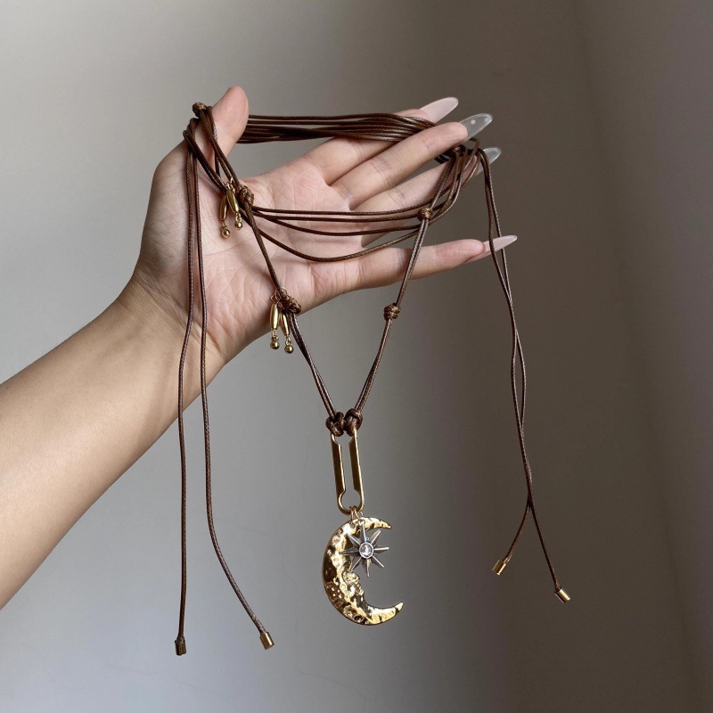 中古vintage金色月亮八芒星吊坠项链女小众设计感毛衣链独特配饰