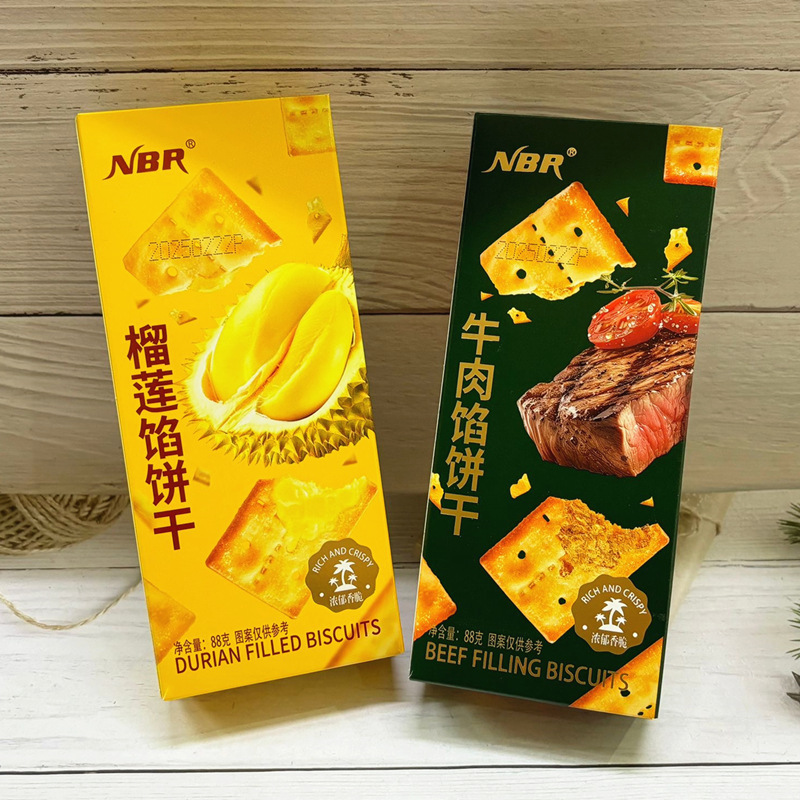 多くの星NBR牛肉の餡のドリアンの餡のサンドイッチのビスケットのサクサクしている午後のお茶のレジャーの間食の軽食の88g箱の中で焙煎します。