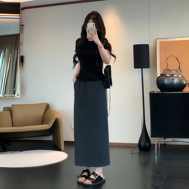 プラスサイズの女性の黒のハイウエストスカート夏ファットmm痩身カバーリンスカートドレープストレートスリットロングスカート