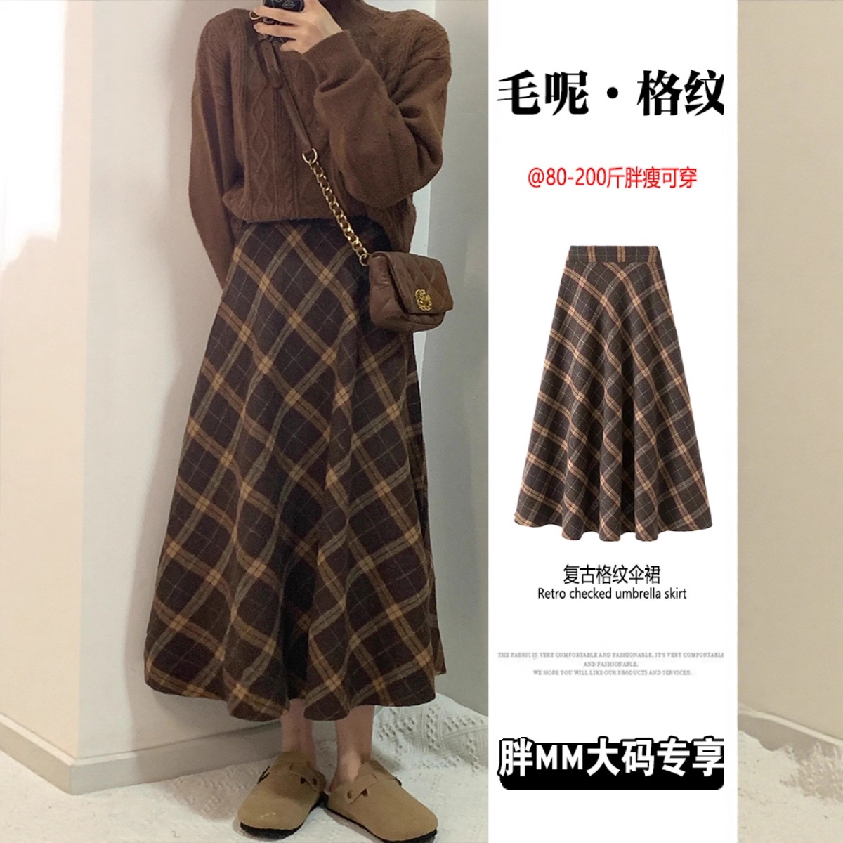 毛呢格纹伞裙半身裙女秋冬2025新款大码胖mm高腰显瘦遮胯a字长裙