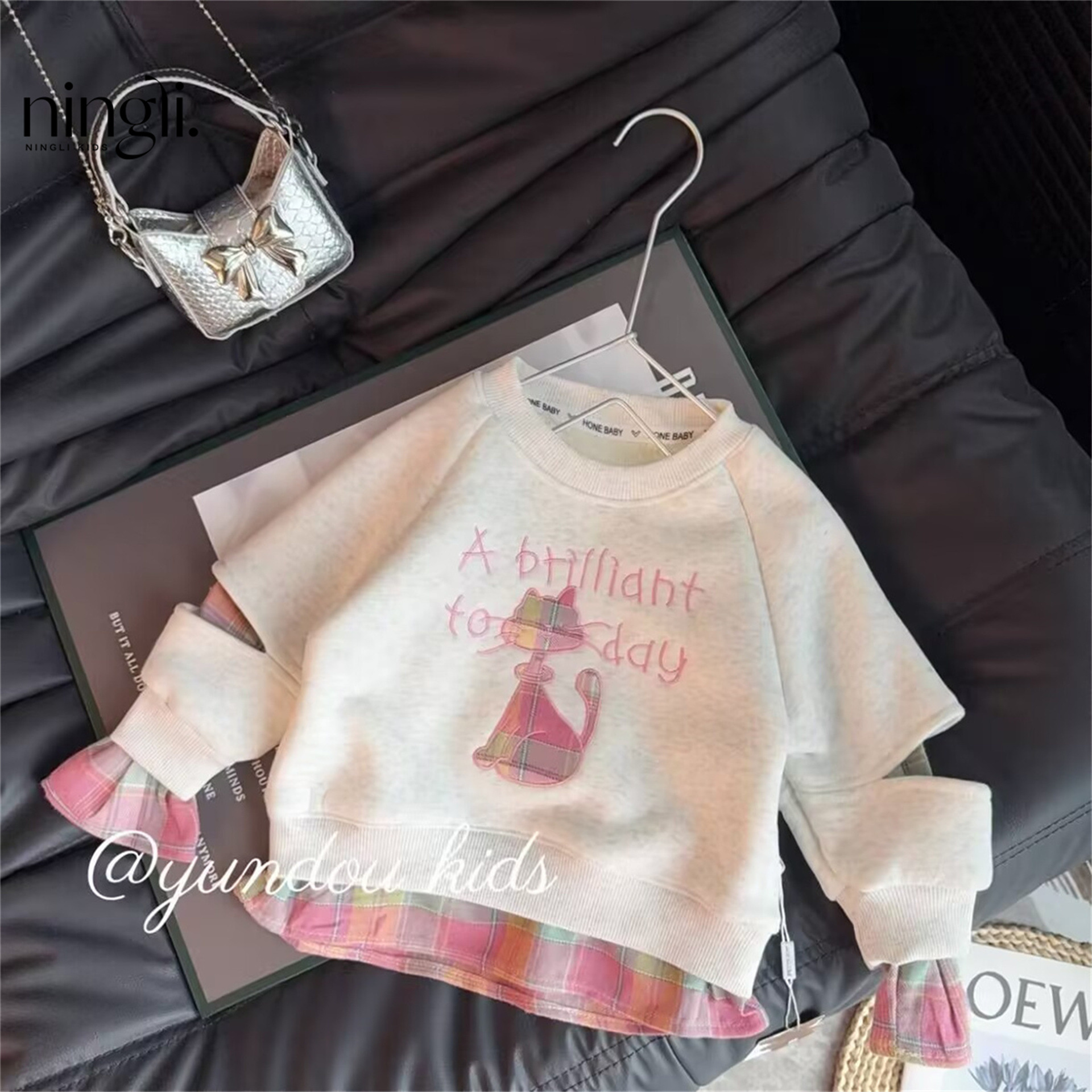 柠里加绒加厚新款刺绣小猫女童卫衣秋冬款时尚宽松髦百搭儿童上衣