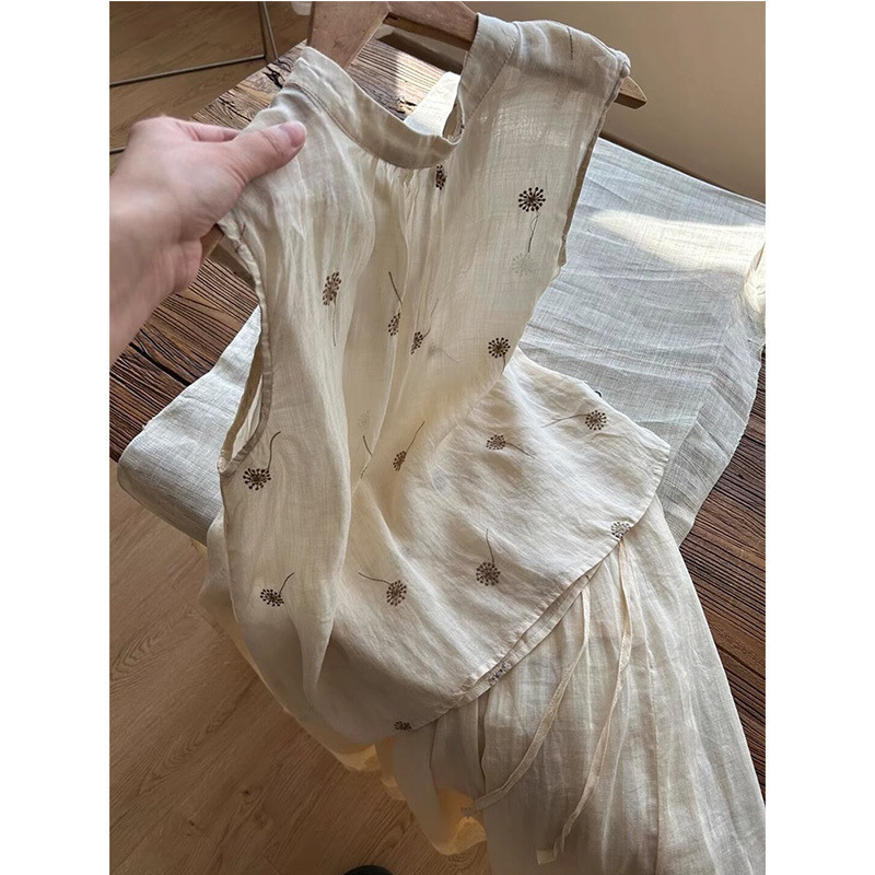韓国の甘いスーツ、超人気のサマードレス、クールでリラックスしたノースリーブ刺繍シャツとワイドパンツの2点セット