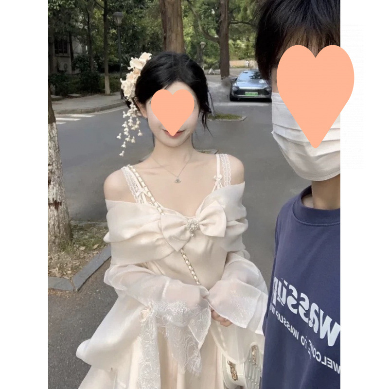 優しく甘い花柄サスペンダースカートスーツレディース夏の日焼け止めショールニットブラウスリボンウエストAラインロングスカート