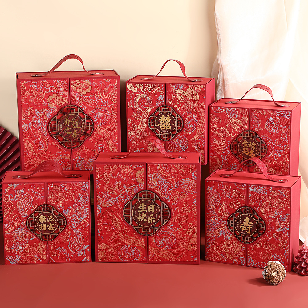 新中式ギフトボックス、両開き式お土産箱、中国風結婚式木製飾り、二重の喜び、新築祝い、誕生日、祝寿、持ち運び可能な箱