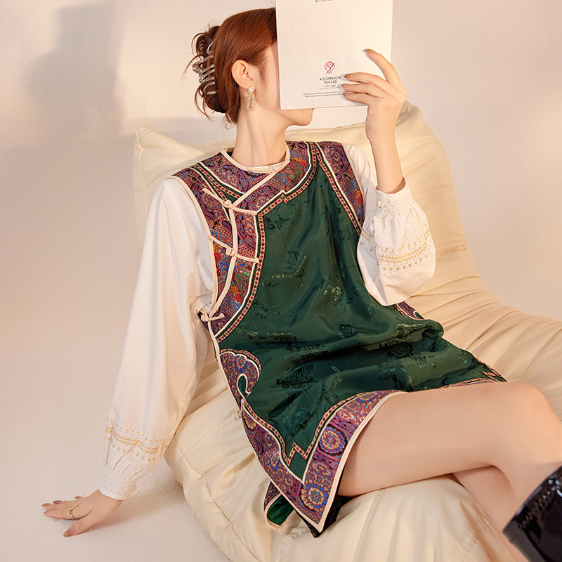 新しい秋の中国風のユニークなデザインの女性用トップス、緑色のミドル丈のレーヨン素材の新しい中国風ベスト ZXモデル M8063