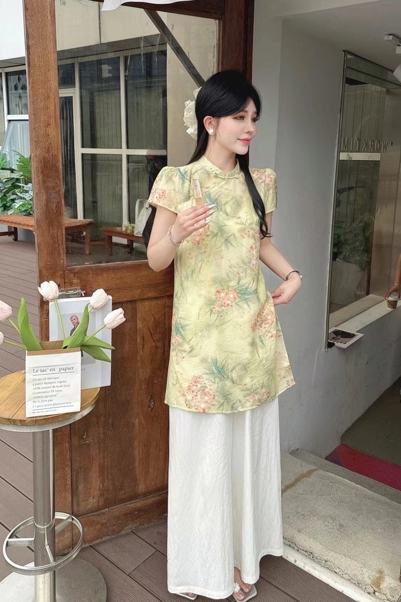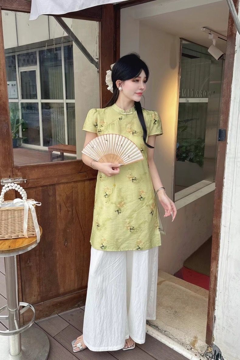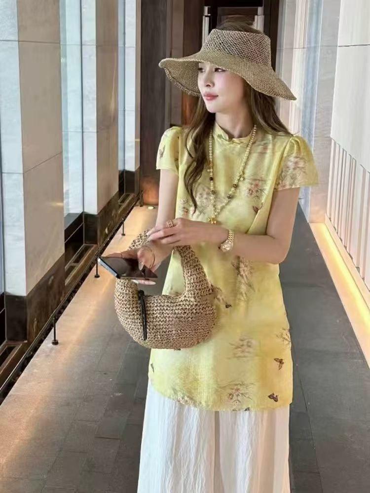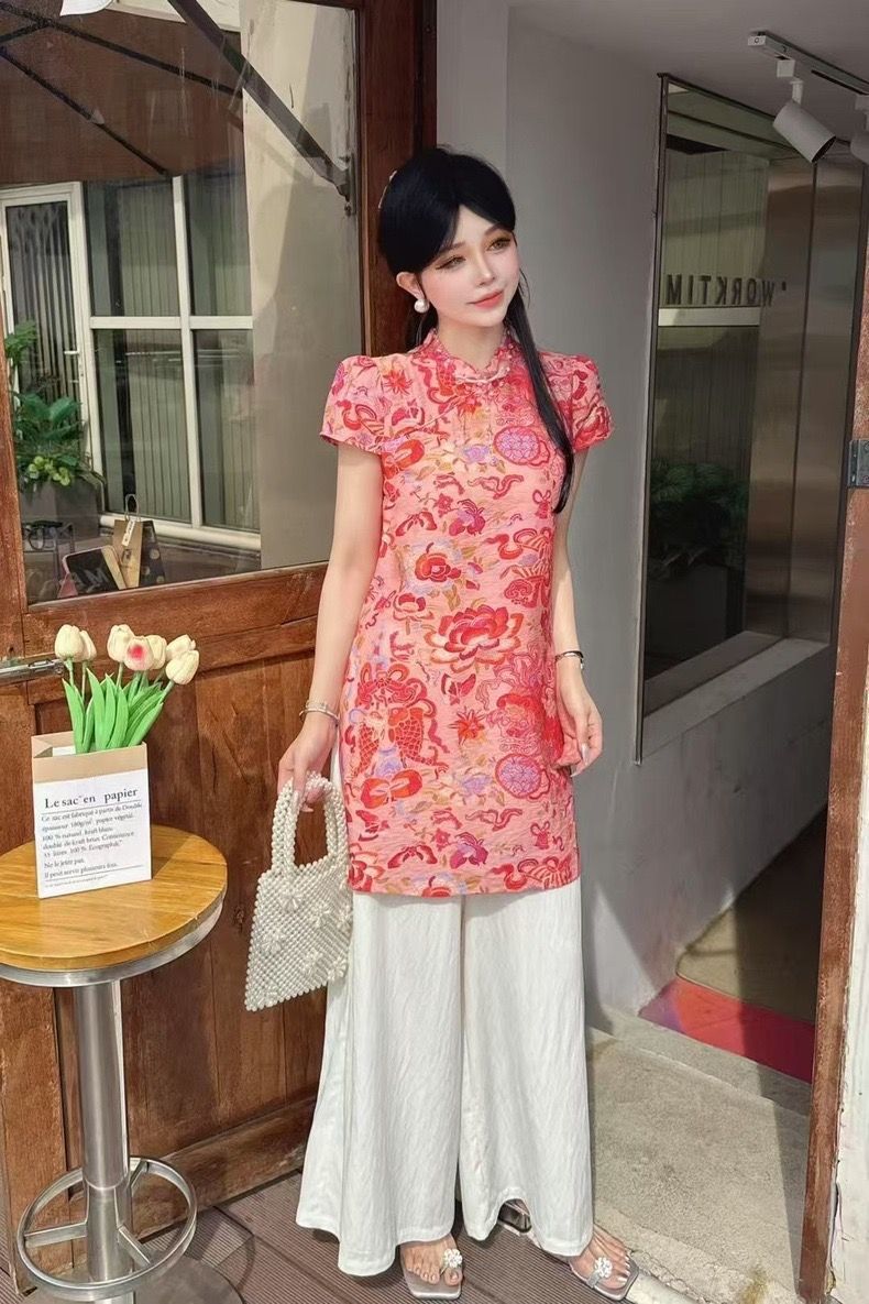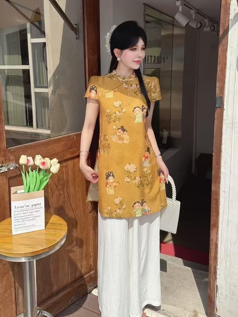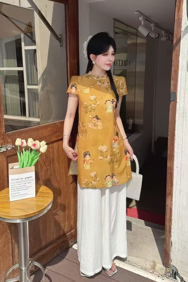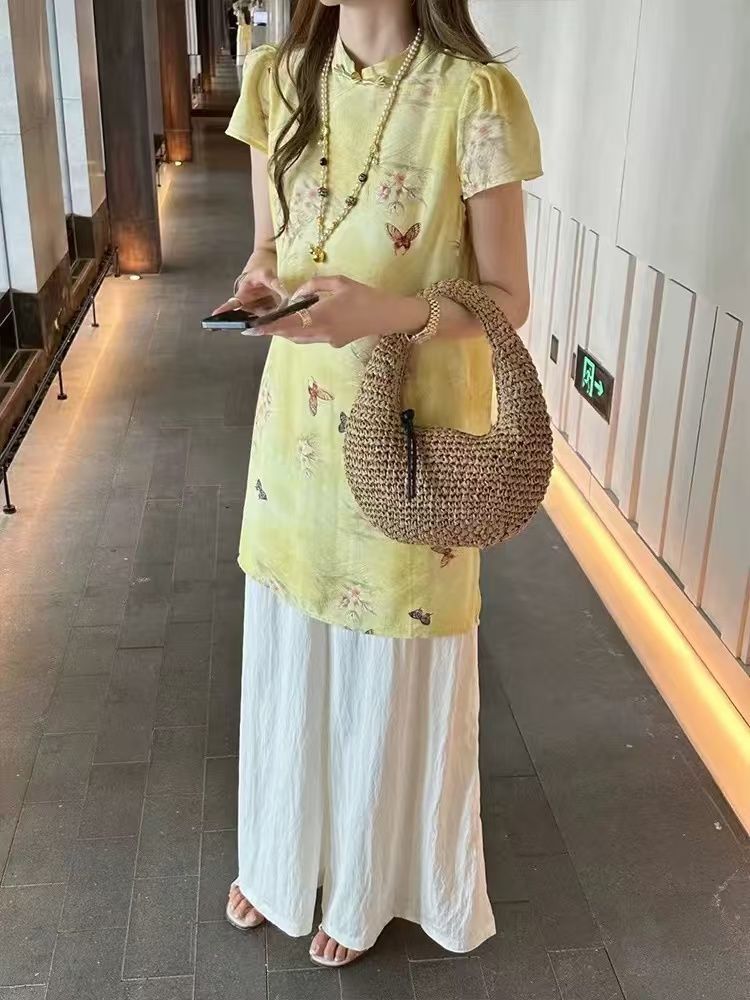 新しい中国風のボタン改良されたチャイナドレストップ国民風スーツ女性の夏の新しいルーズパンツワイドレッグパンツ 2 点セット
