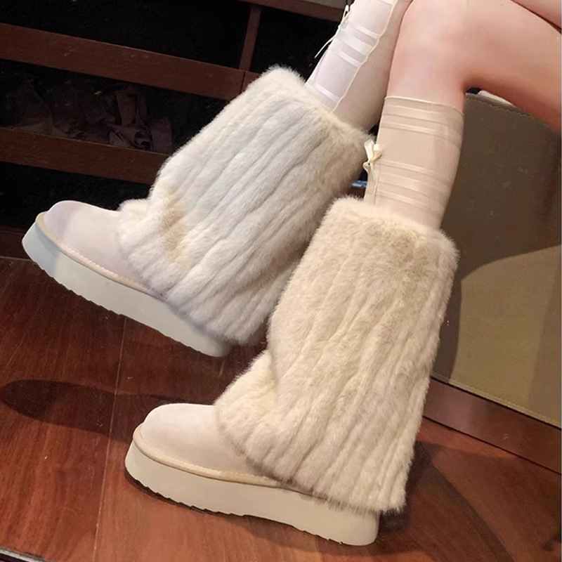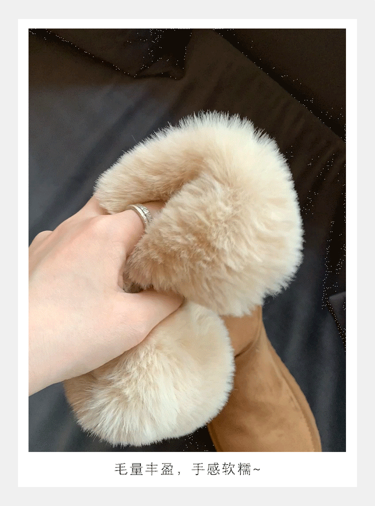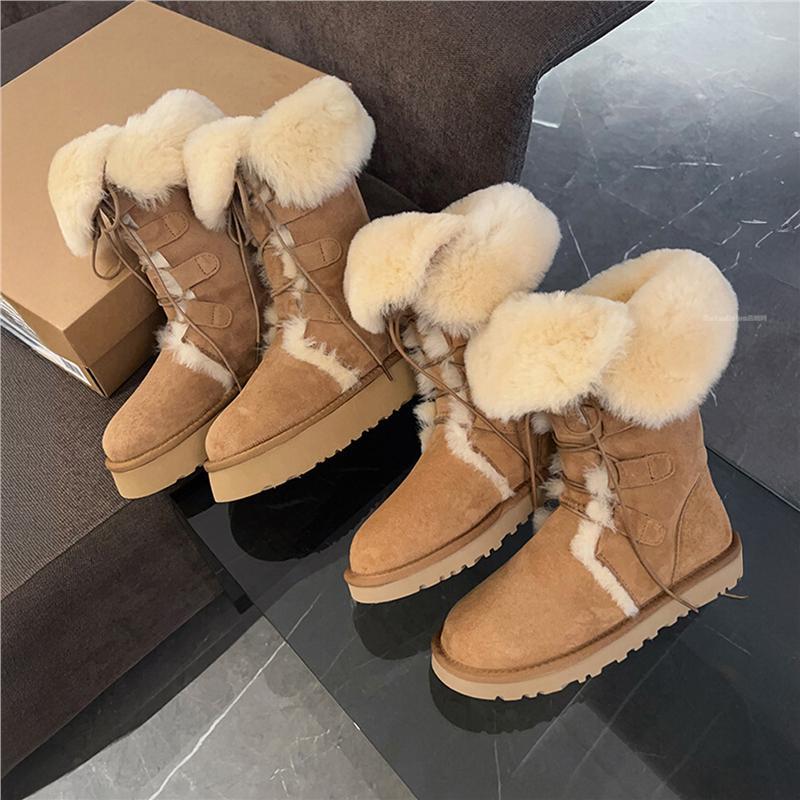 香港系带平底圆头保暖雪地靴女2025冬新款时尚中筒靴舒适毛毛长靴