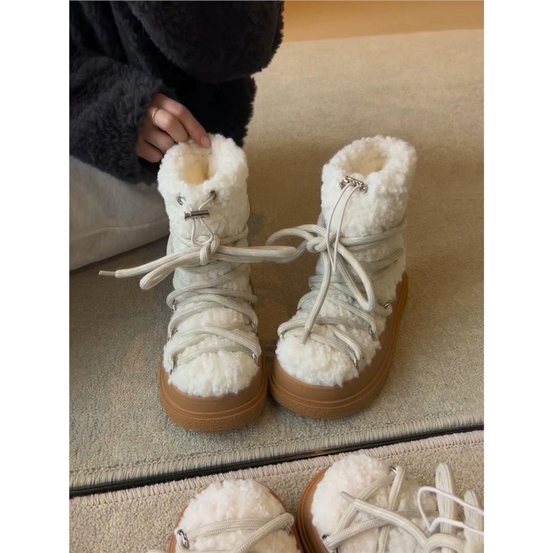 鹿小兽~厚底白色毛毛靴加绒加厚绑带雪地靴东北棉鞋女保暖短筒靴