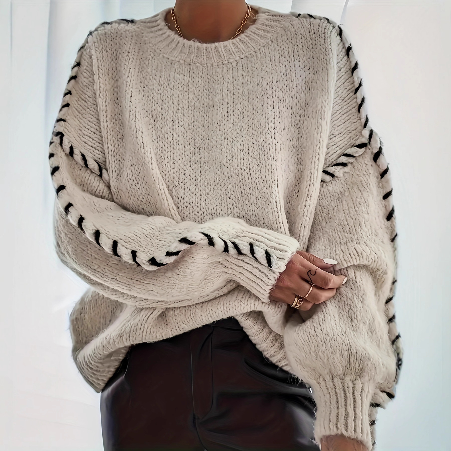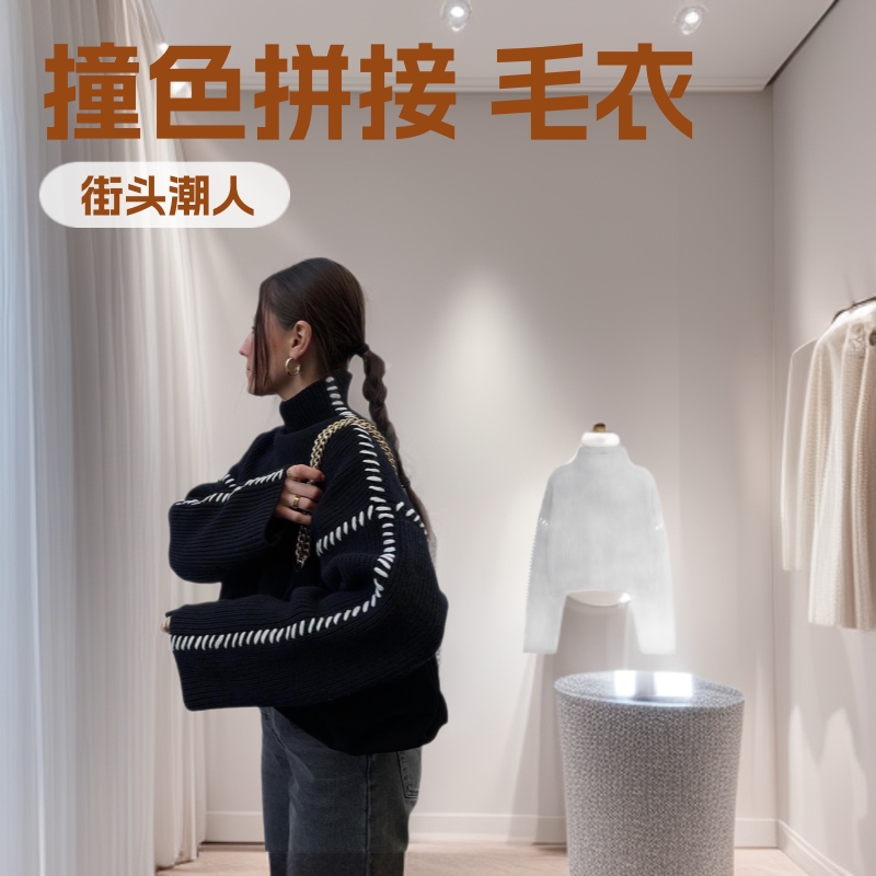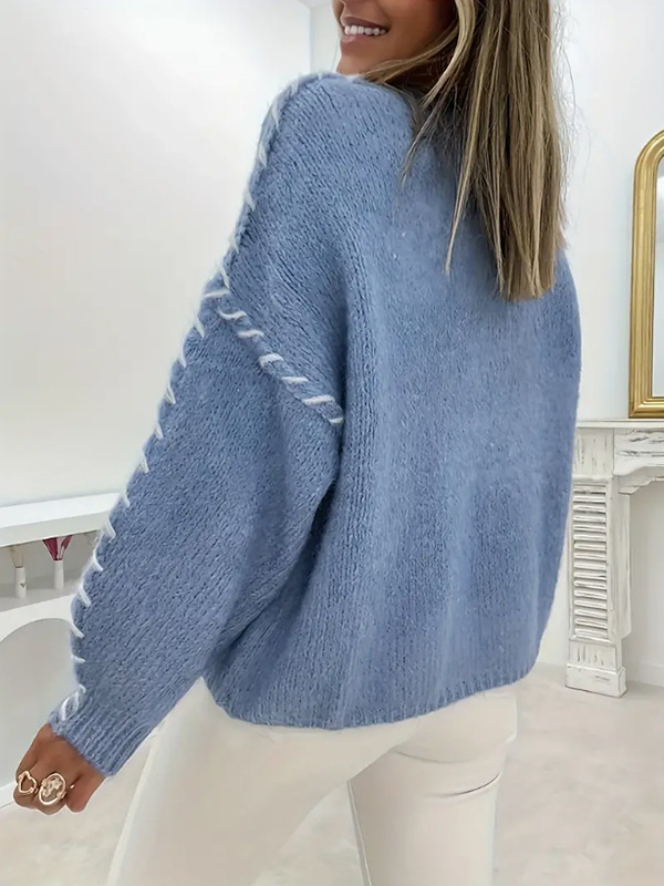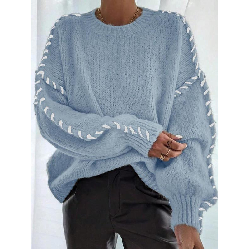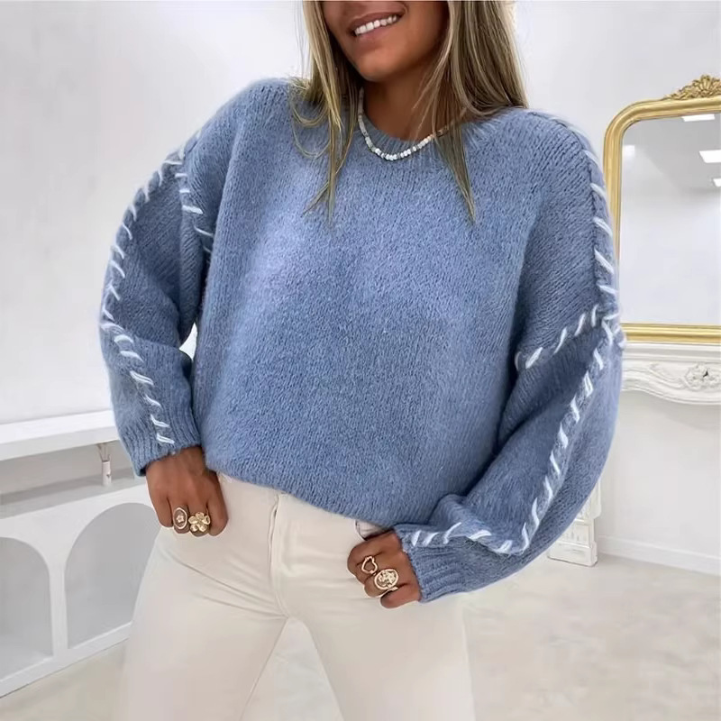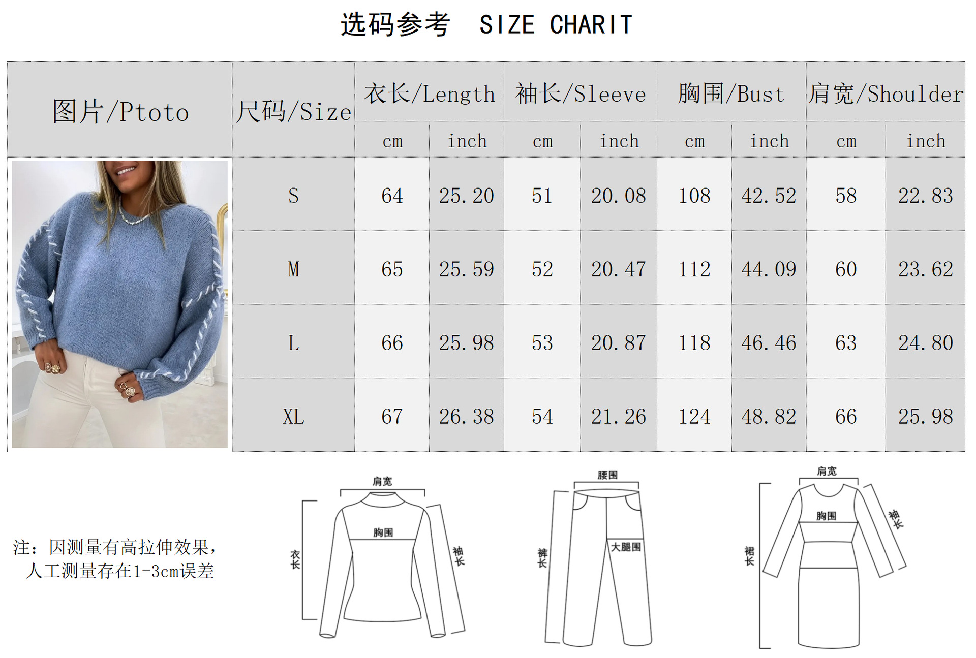 跨境亚马逊秋冬女士时尚休闲简约圆领撞色套头衫上衣