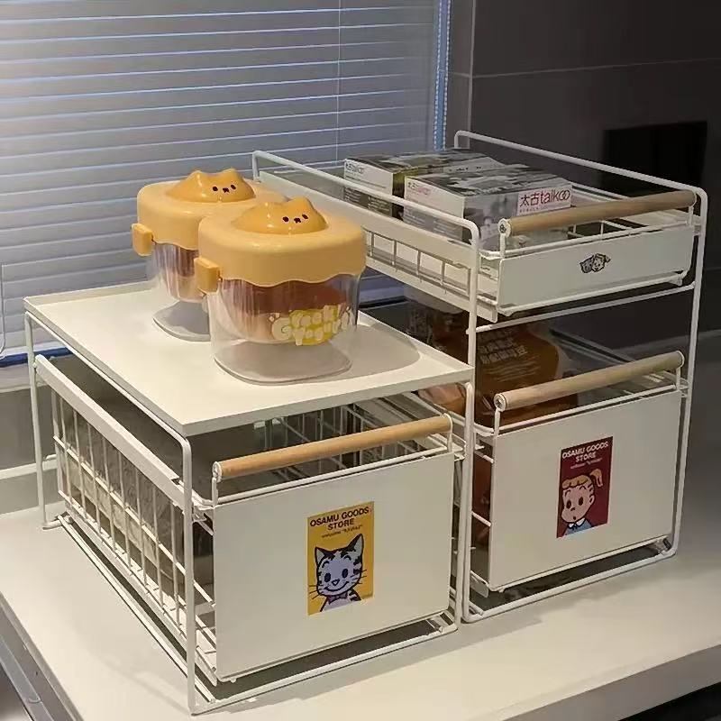 家庭用キッチンキャビネットバスケット、シンク下収納ラック、二層多機能調味料収納引き出し式階層ラック