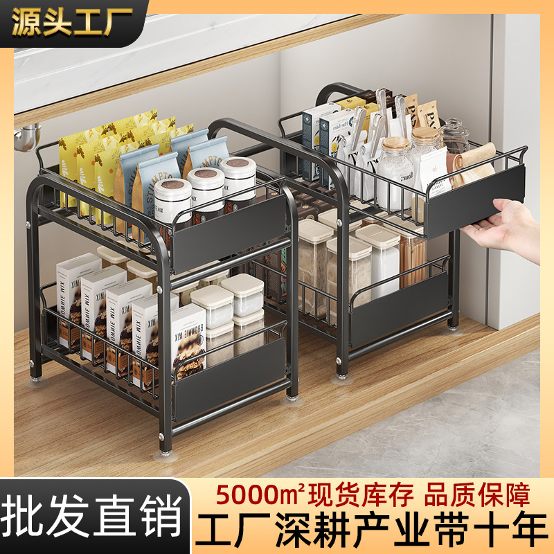 家用厨房橱柜拉篮下水槽置物架双层多种功能调料收纳抽拉式分层架