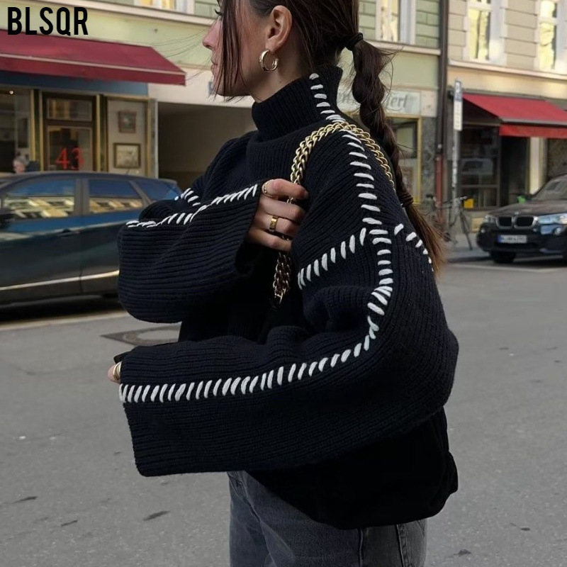 女性の卸売 2024 セーター秋ラウンドネックニット暖かいオールマッチシックなコントラストステッチ糸セーター M6221