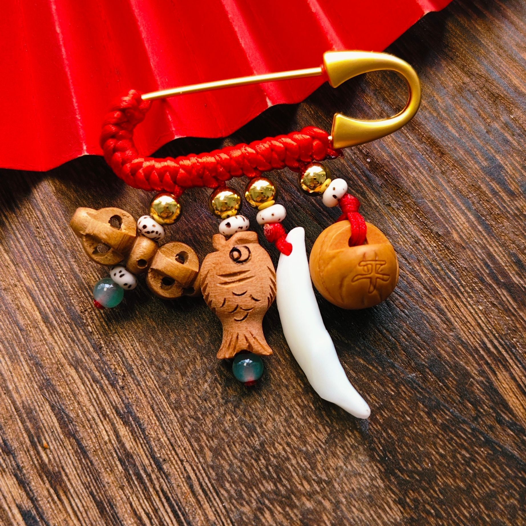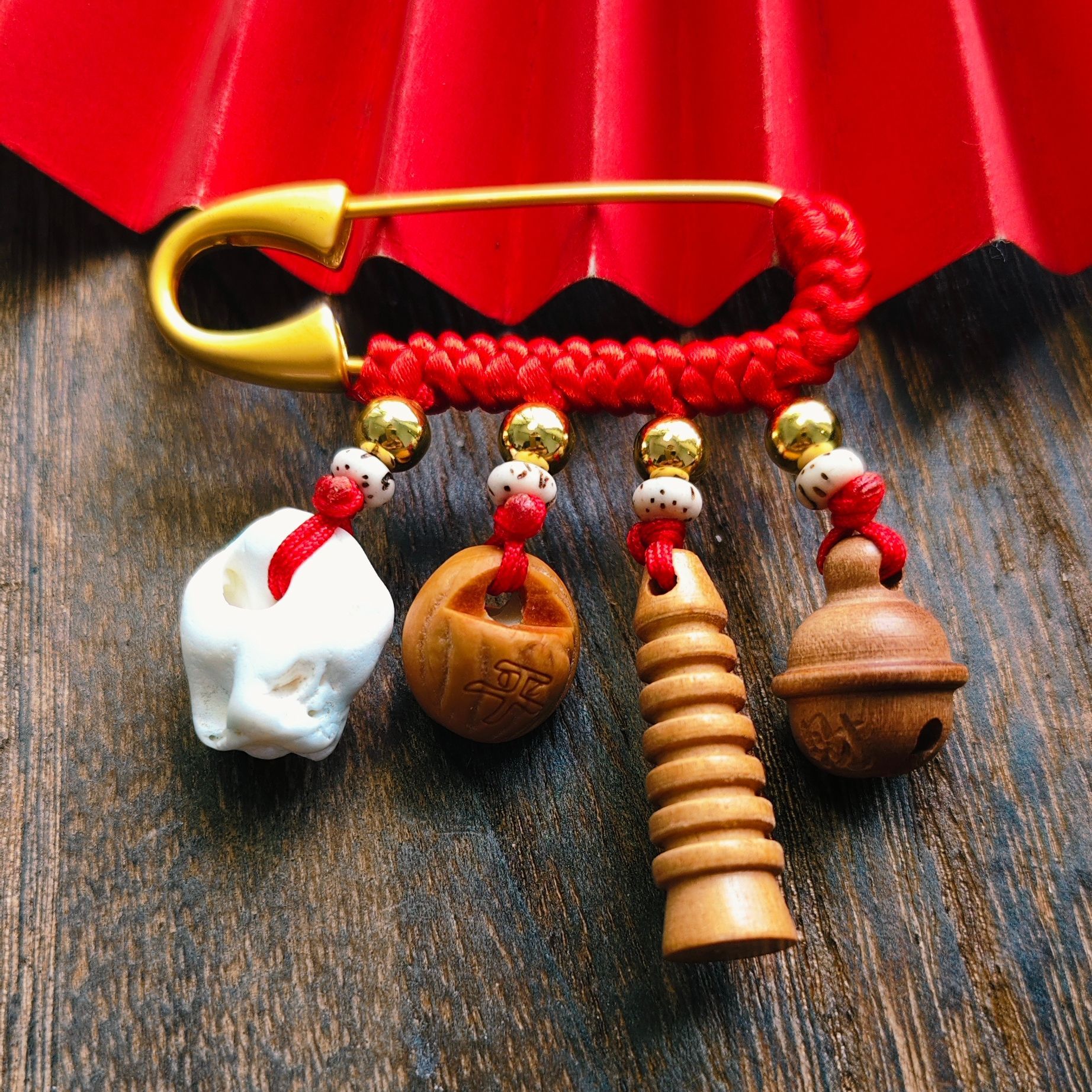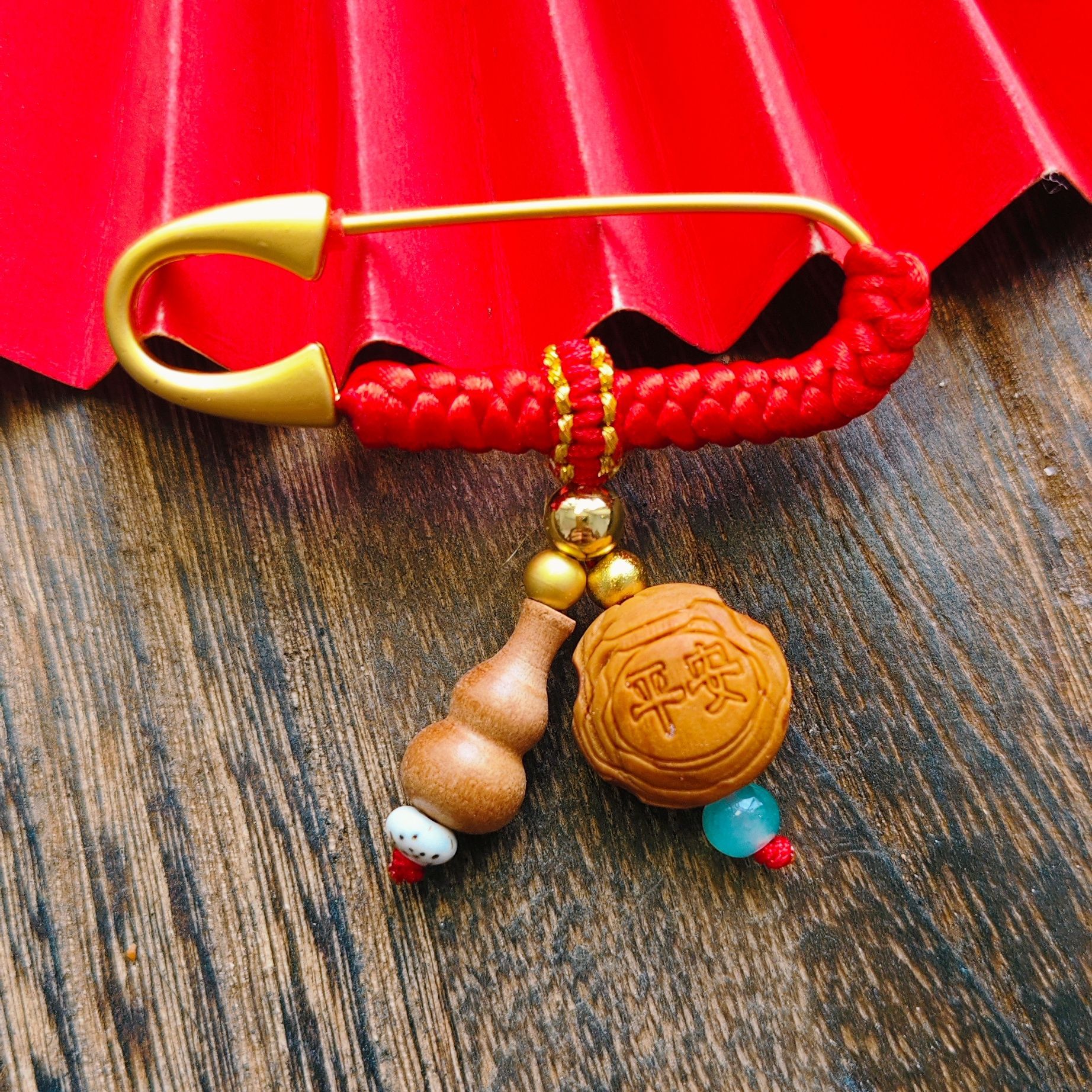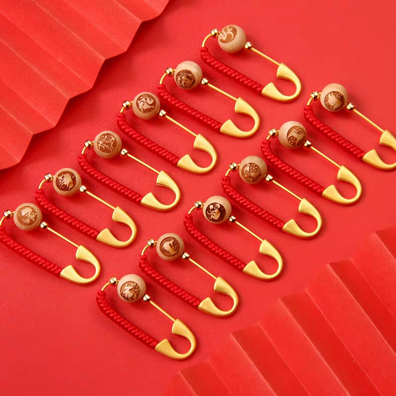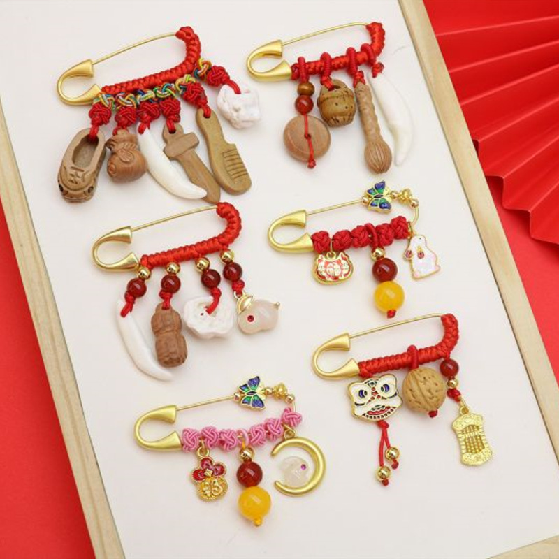 宝宝孕妇压惊别针 复古胸针 金色手工红编绳婴儿卡通随身携带挂件
