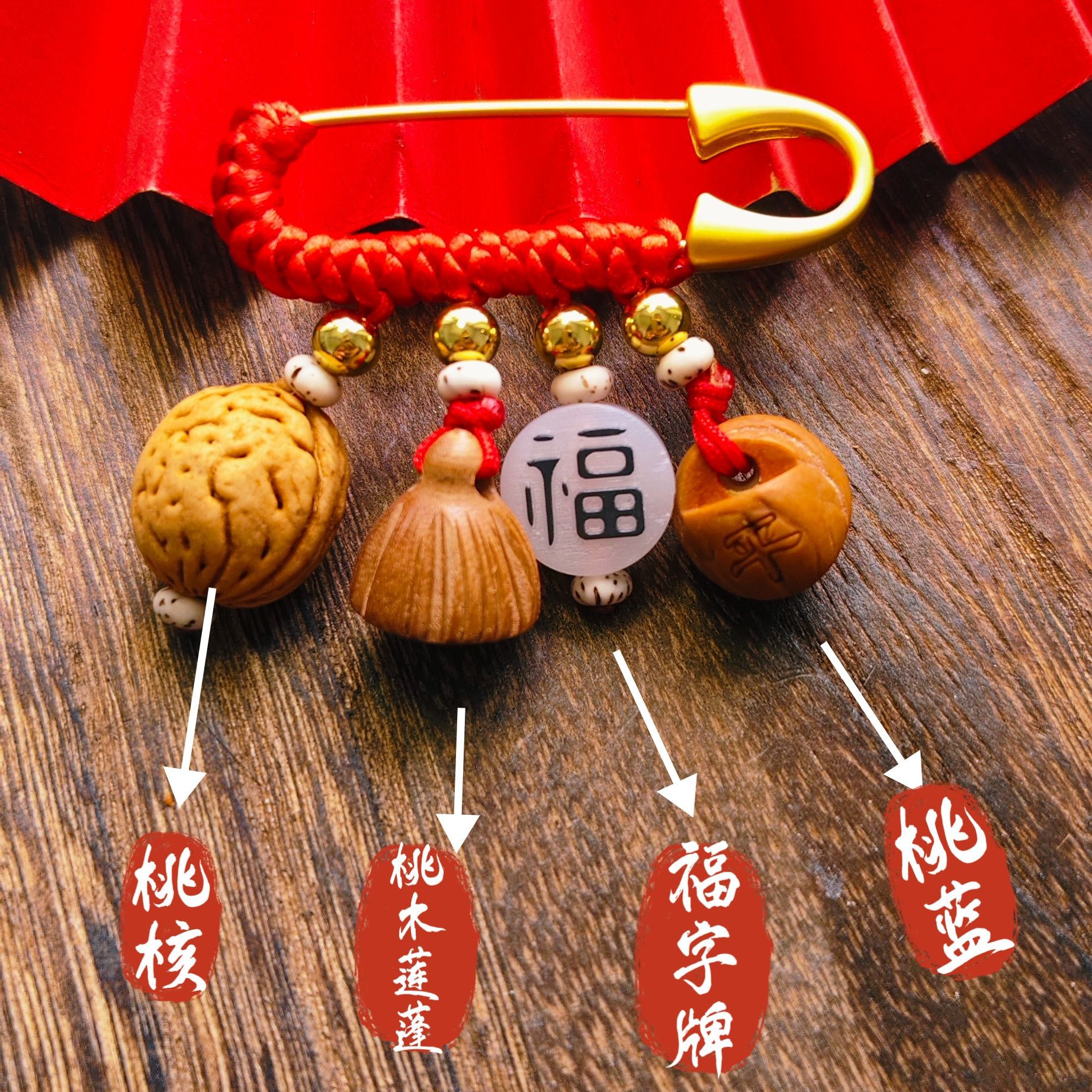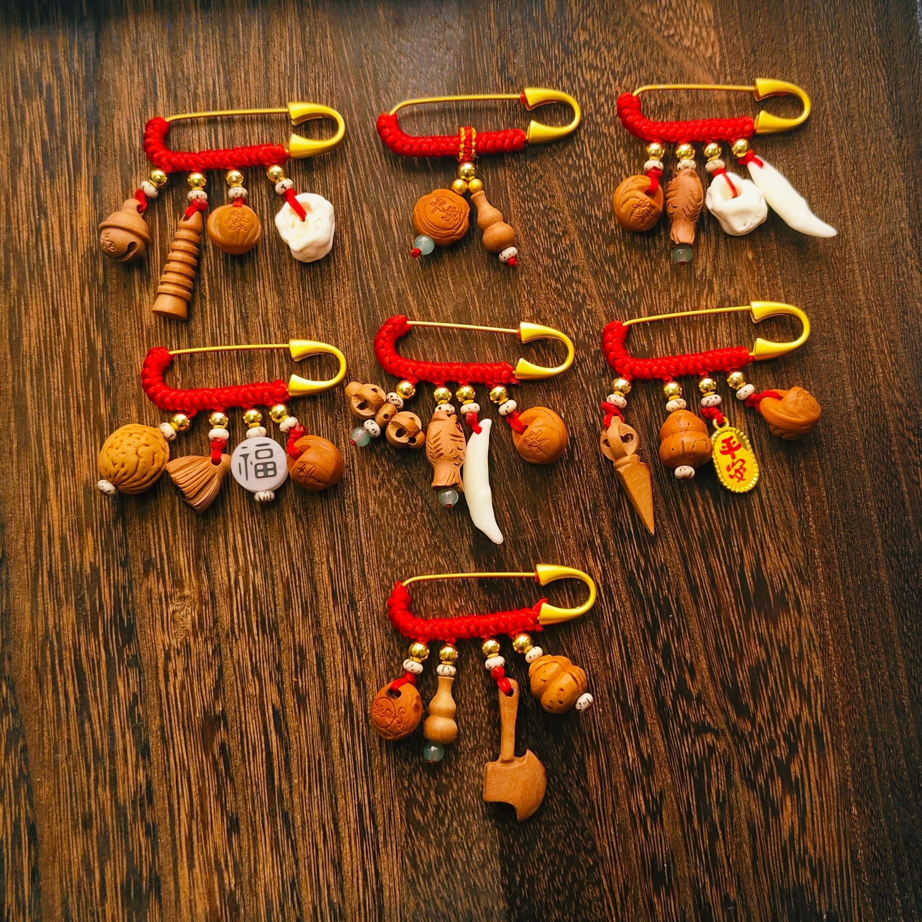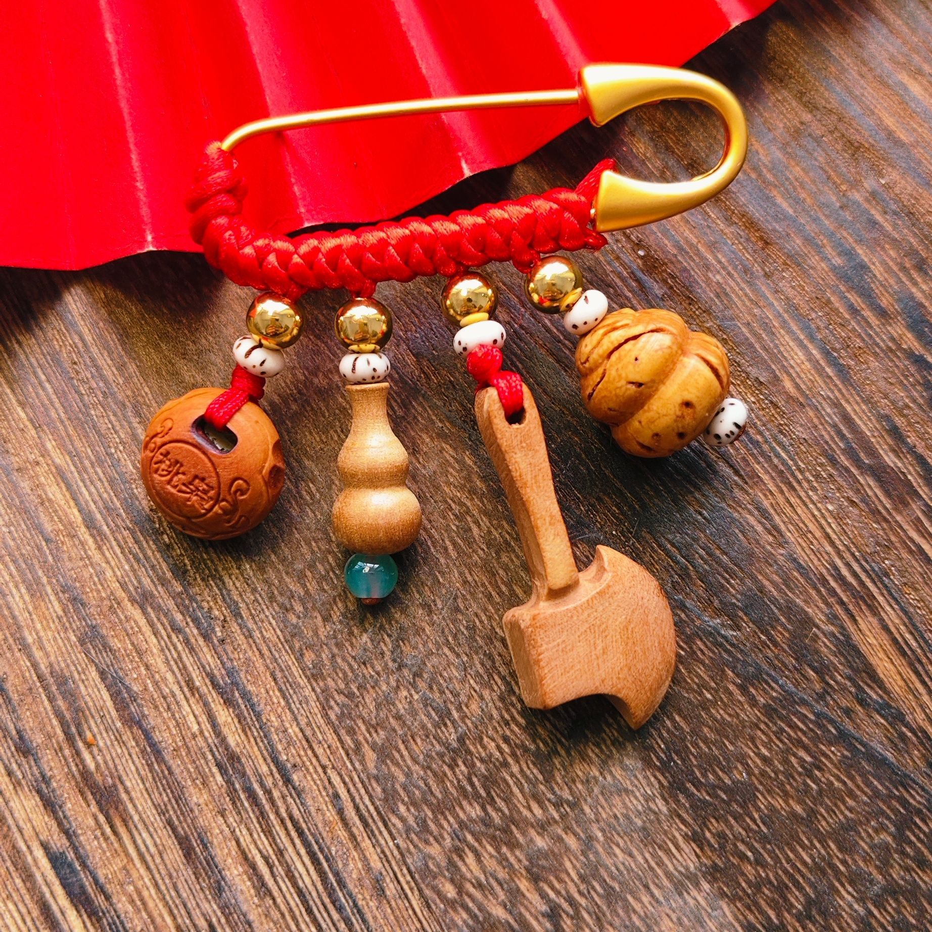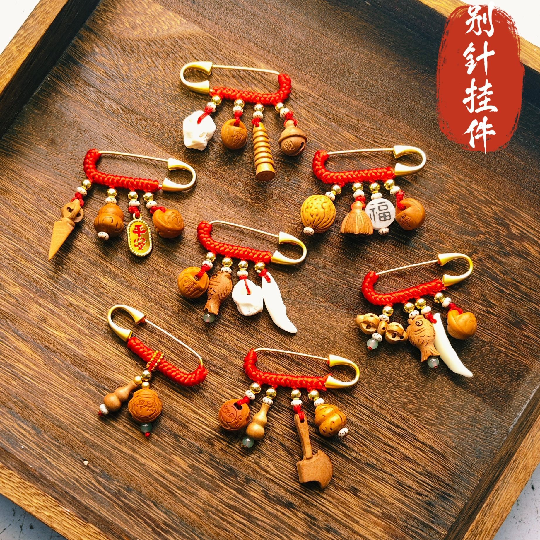 宝宝孕妇压惊别针 复古胸针 金色手工红编绳婴儿卡通随身携带挂件