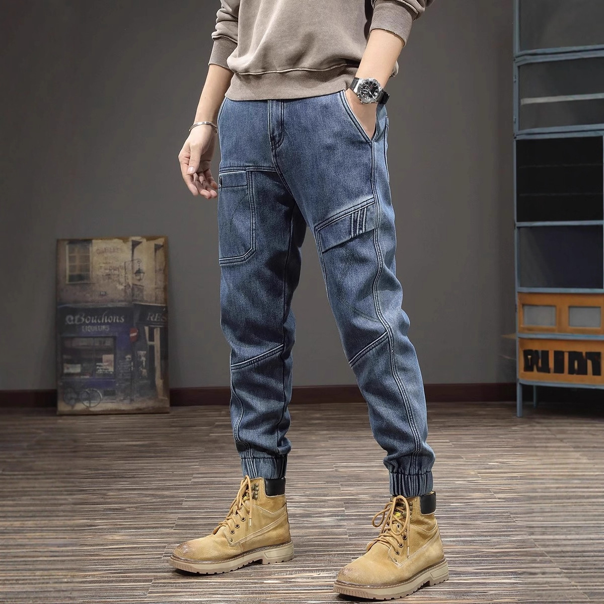 春秋潮牌美式复古弹力牛仔裤男束脚哈伦裤宽松休闲痞帅修身工装裤