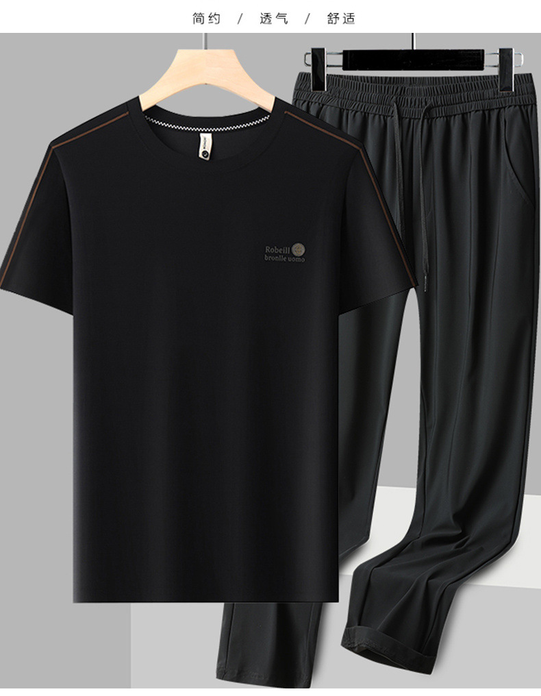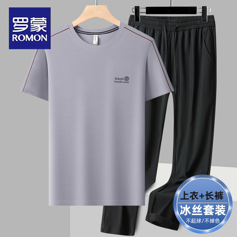 【ストレッチアイスシルクスーツ】ロモンカジュアルメンズ夏薄手半袖Tシャツとズボンの若者と中年の2点セット