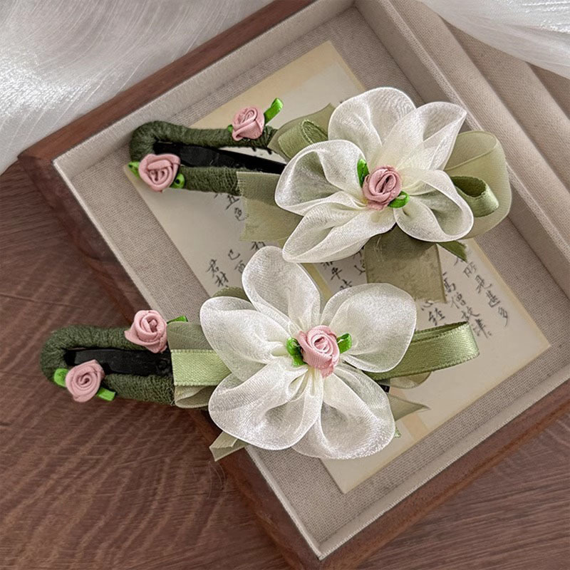フェアリースタイルメッシュリボンフラワーアヒル口クリップ女性の春と夏の雰囲気甘い多用途ヘアクリップ新しい生地ヘアアクセサリー