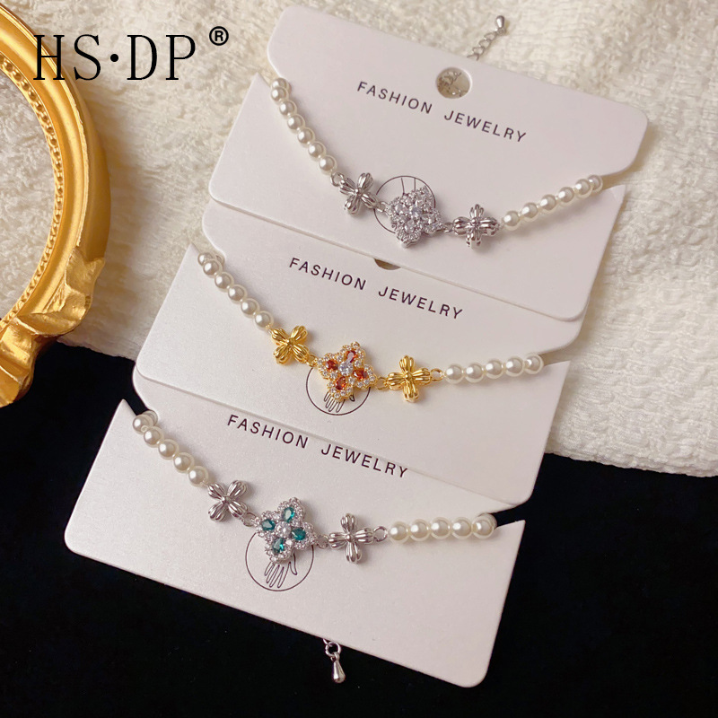日韩温柔百搭金属锆石四叶花珍珠手链轻奢气质简约可调节手环批发