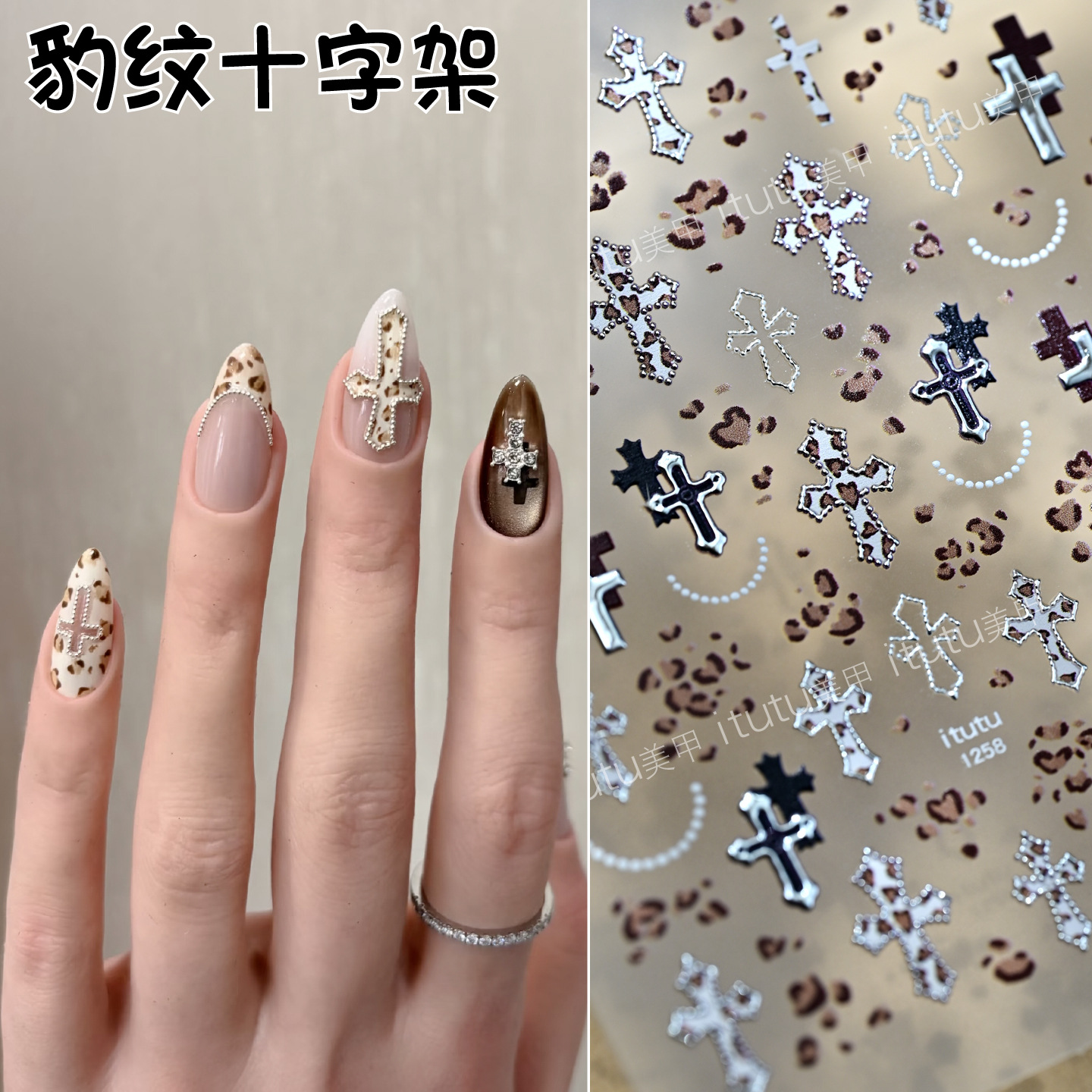 itutu豹纹圣诞烫金美甲贴纸浮雕十字架甜酷豹纹指尖小图案1258