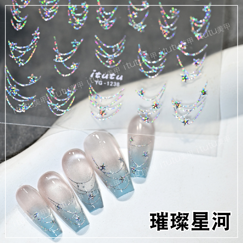 Itutuの新商品の輝く星河の箔押しのネイルシールの七色のレーザーの星のチェーンの銀色の小さい図案の1235
