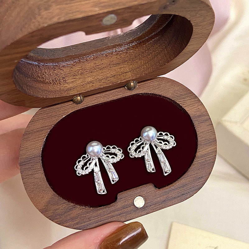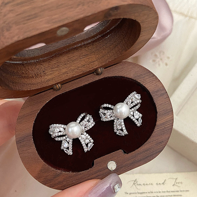 蝴蝶结蕾丝花边珍珠耳钉女微镶锆石甜美精致小巧耳环时尚百搭耳饰
