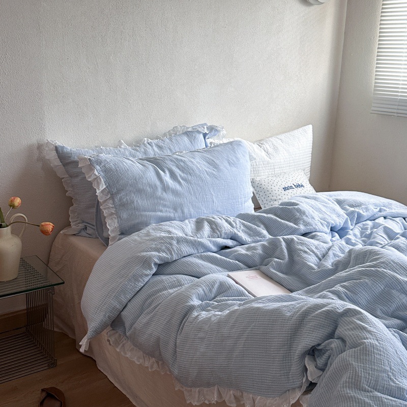 ins小清新浅蓝花边全棉四件套A类皱皱纱色织纯棉床单被套纱布床品